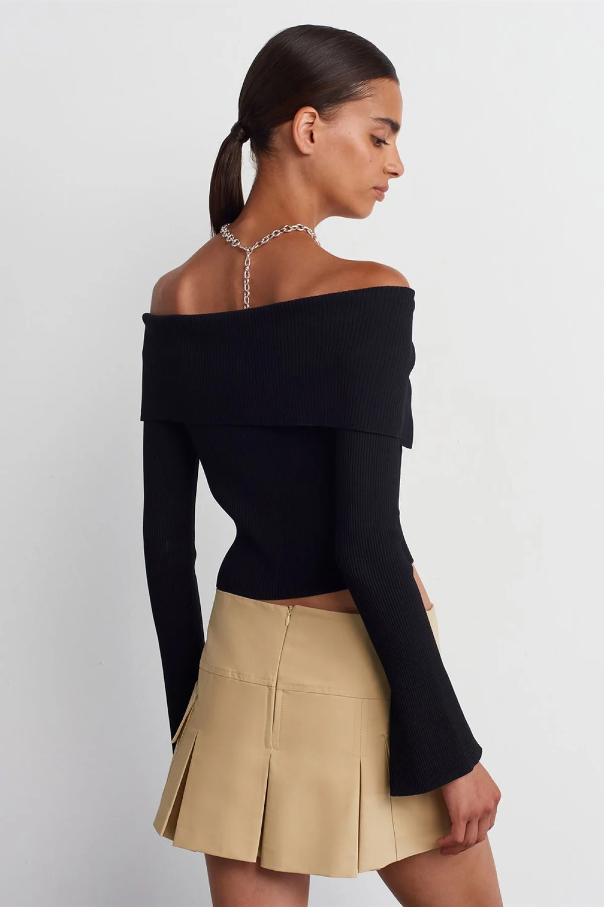 Bardot Yaka Fermuarlı Triko Siyah Hırka