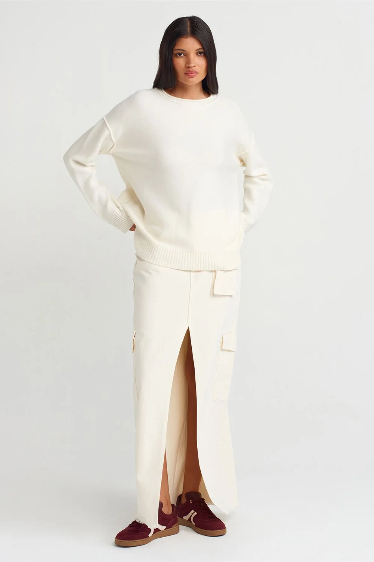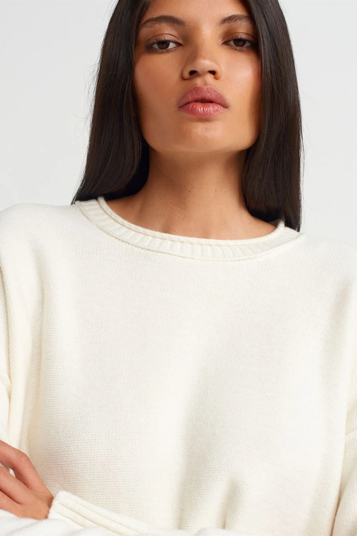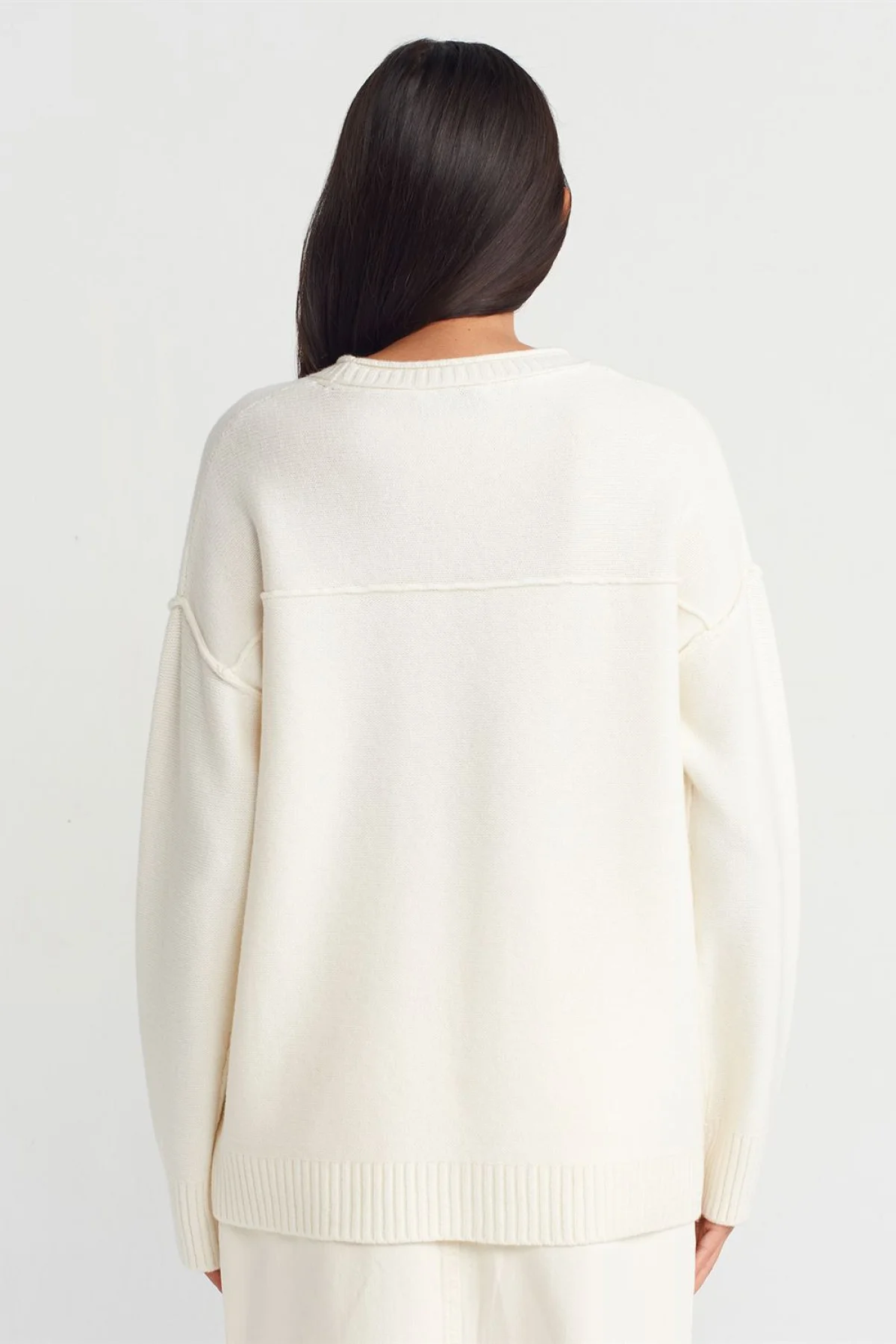 Bisiklet Yaka Dikiş Detaylı Triko Ekru Kazak