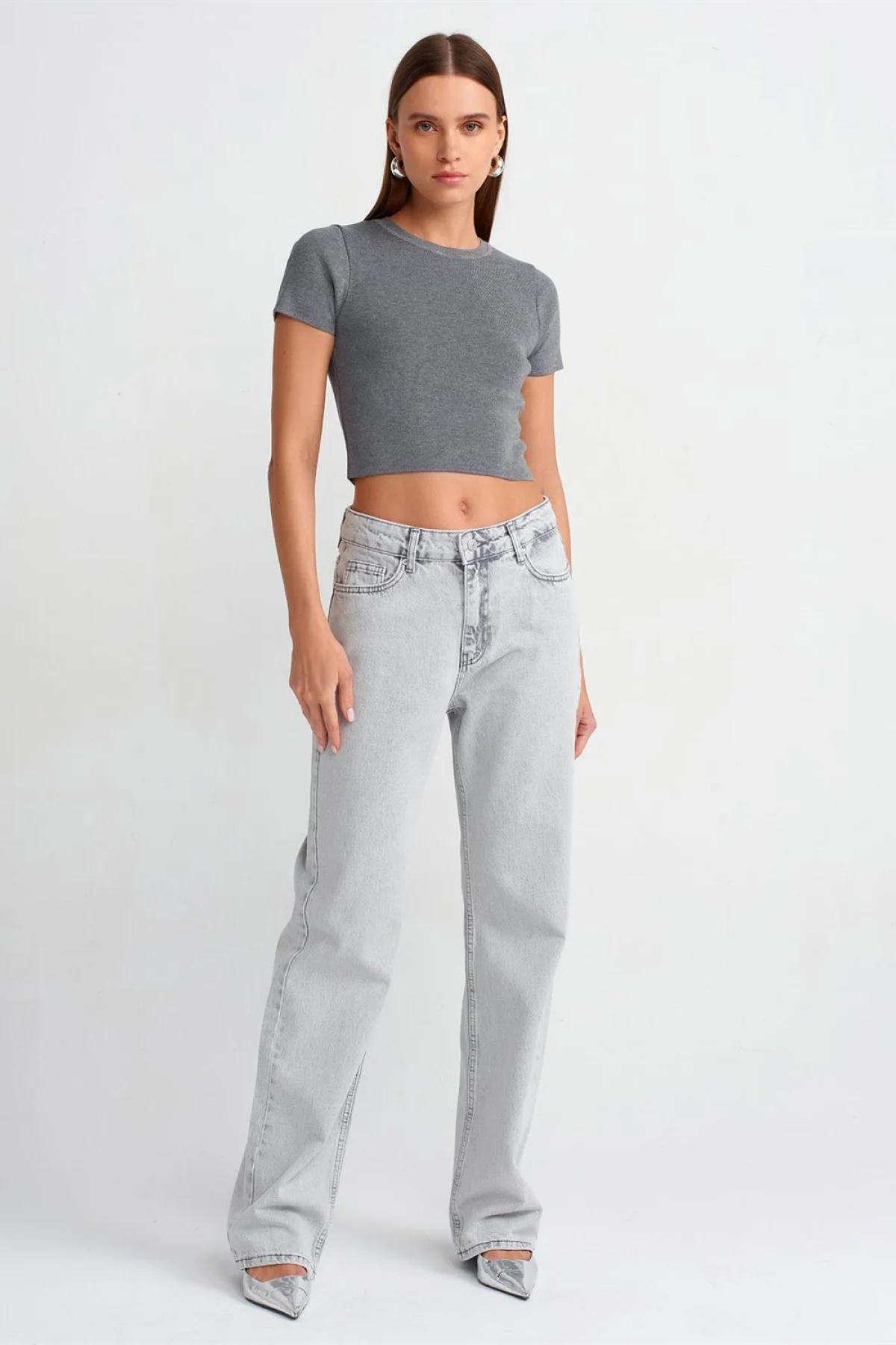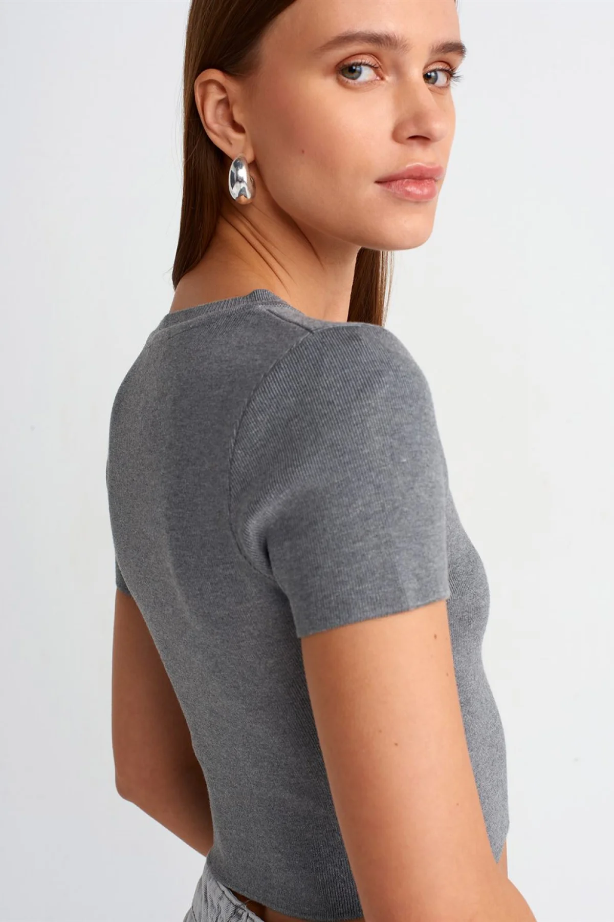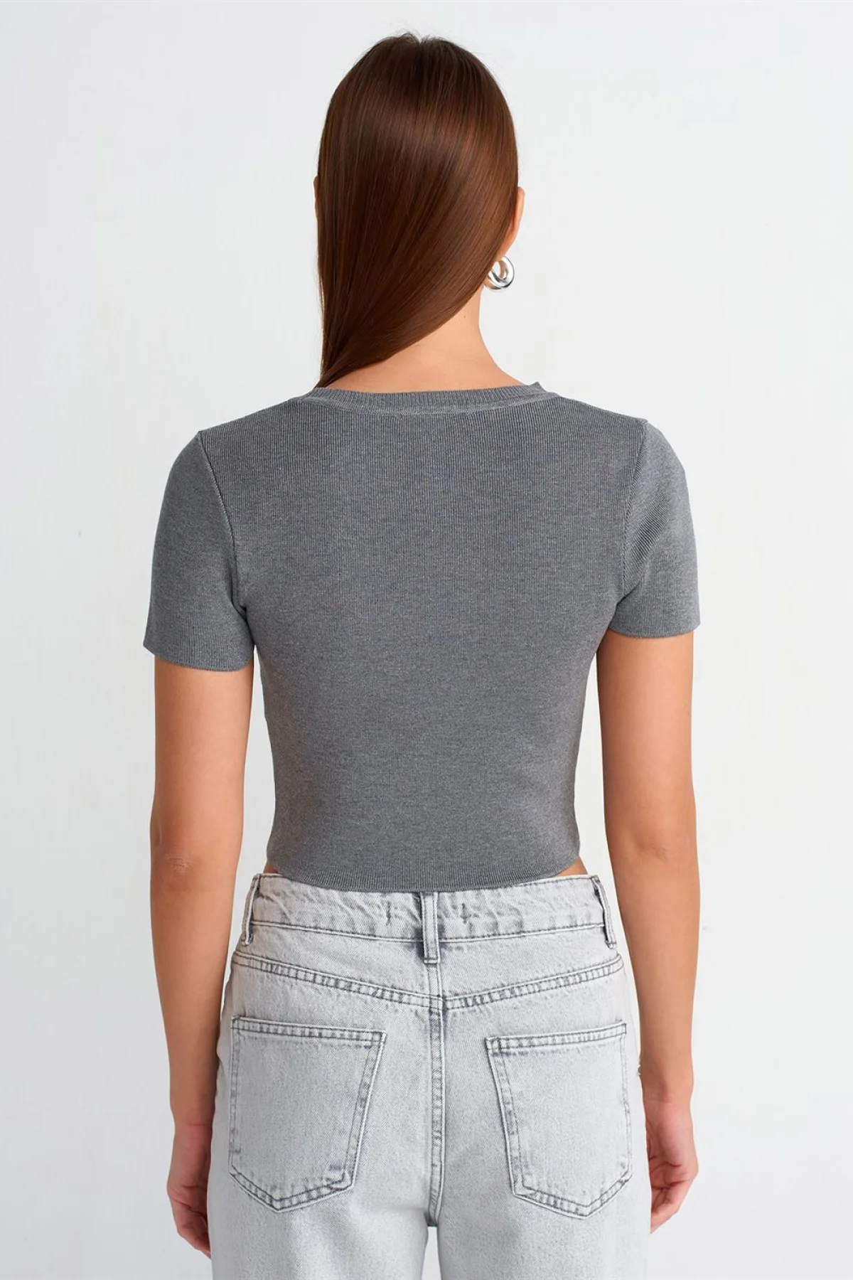 Bisiklet Yaka Kısa Kol Füme Crop Kazak