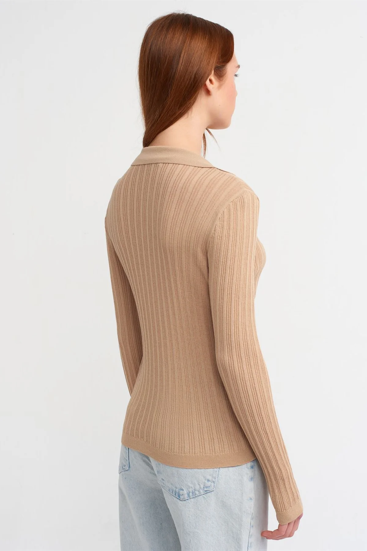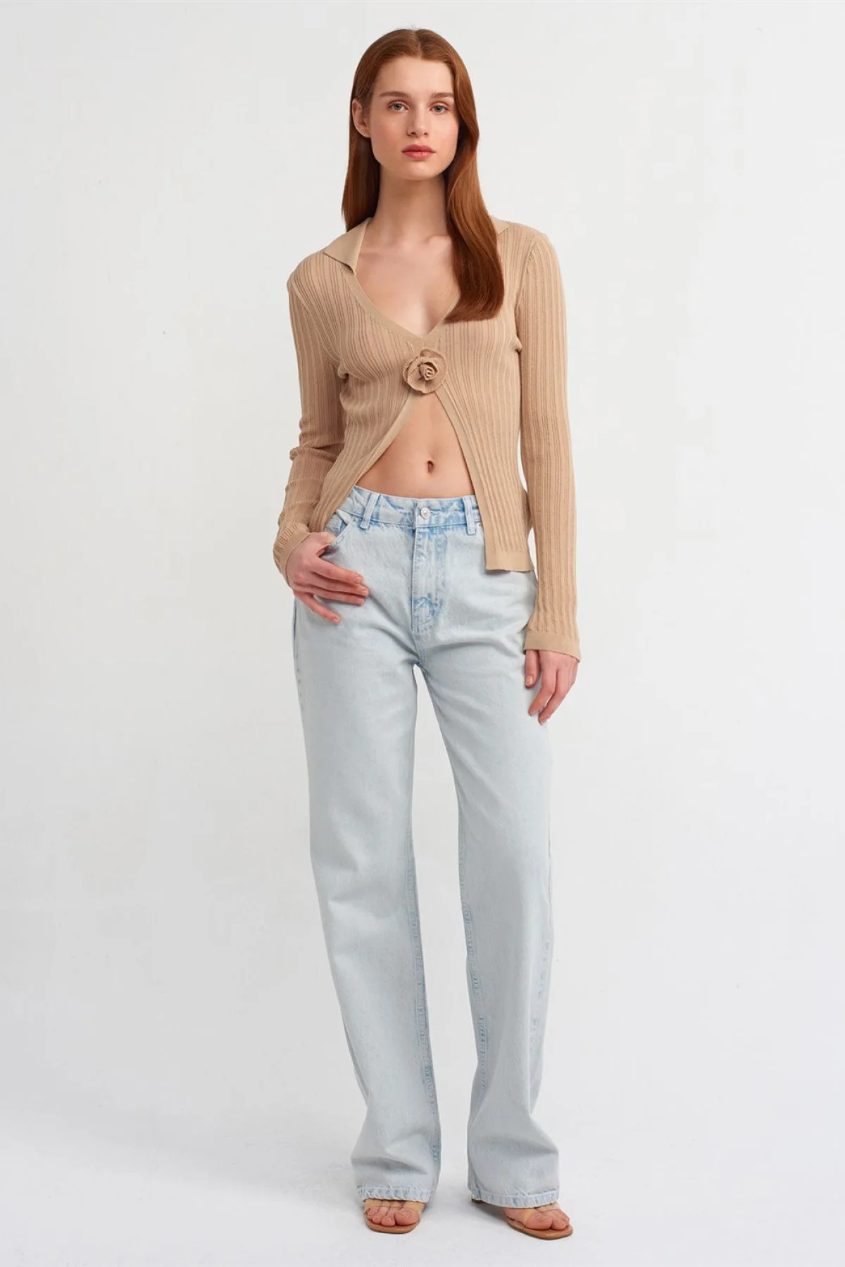 El İşi Çiçek Detaylı Transparan Bej Triko Bluz