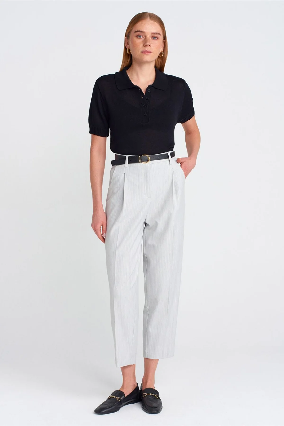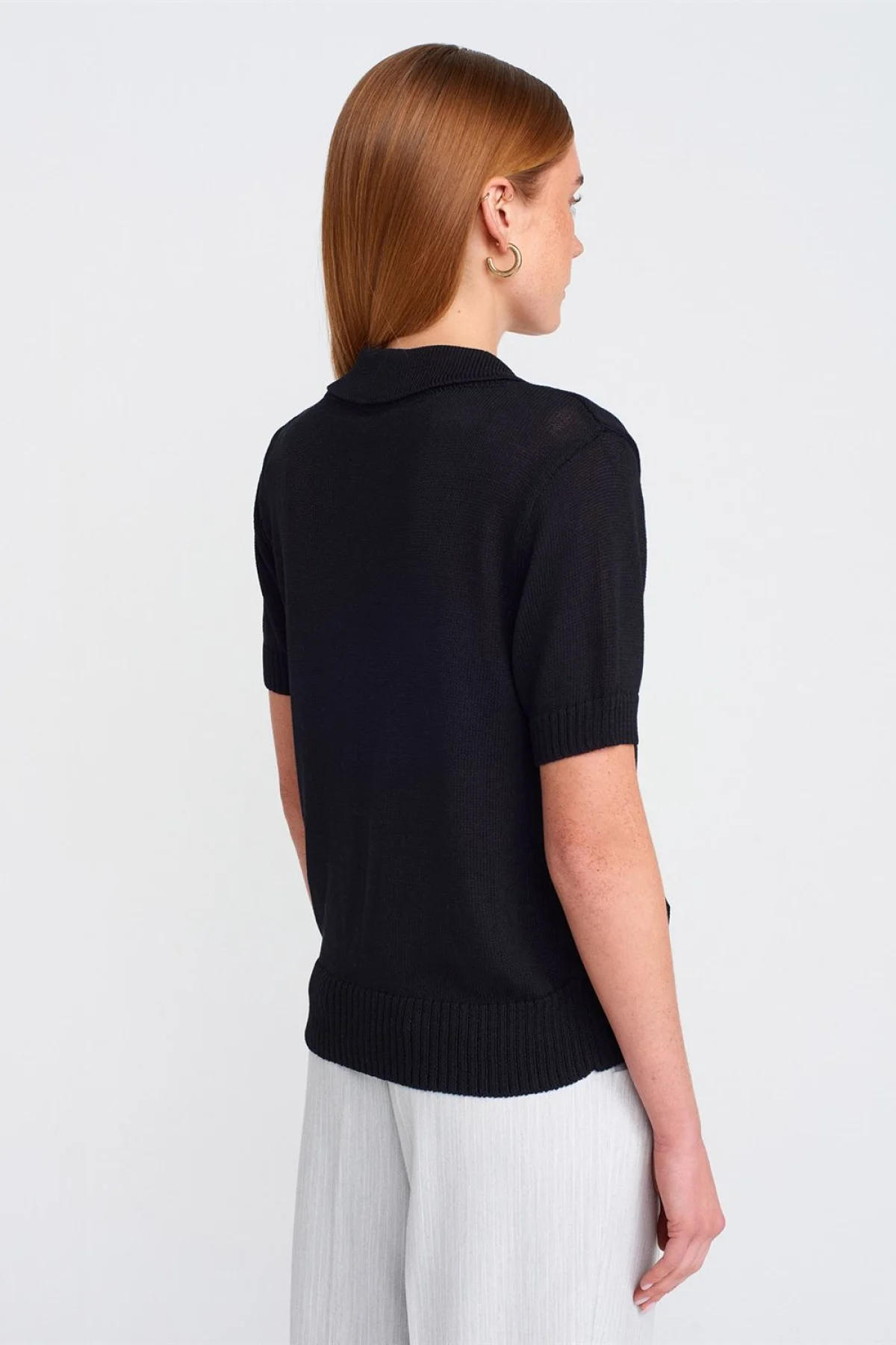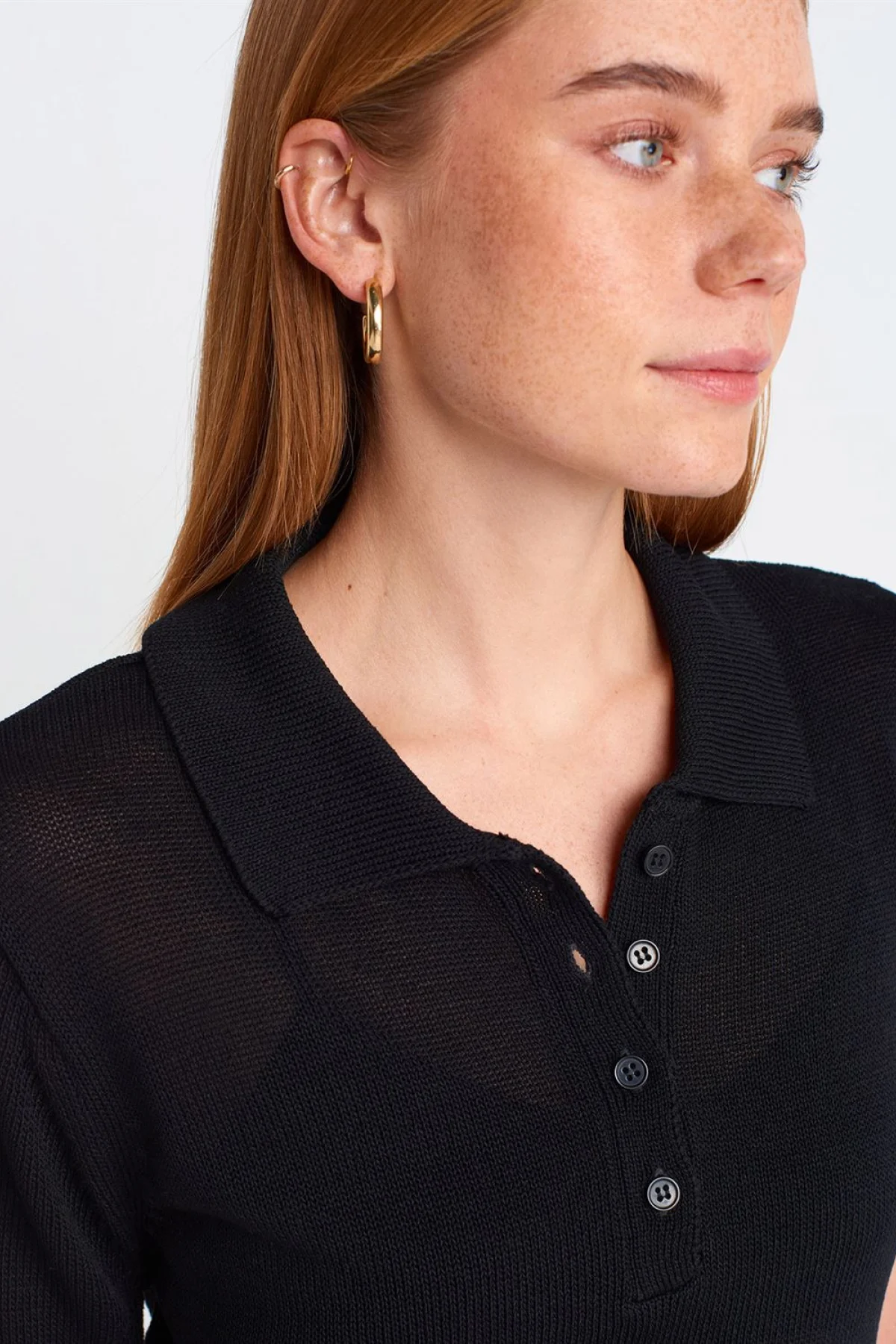 Polo Yaka Düğmeli İnce Siyah Bluz