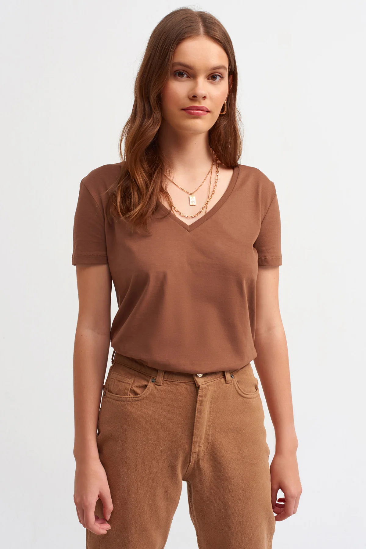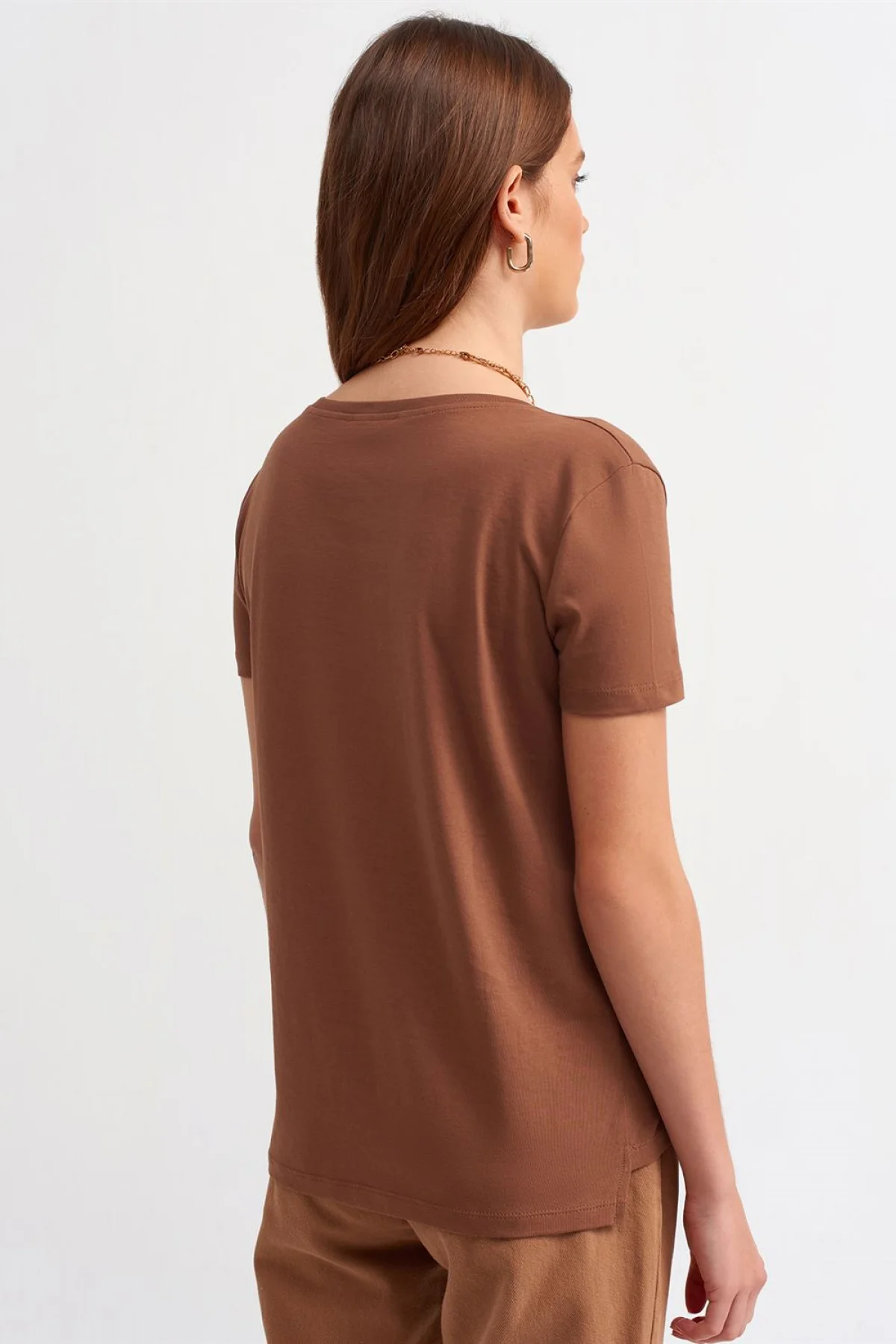 V Yaka Basic Kahve T-Shirt