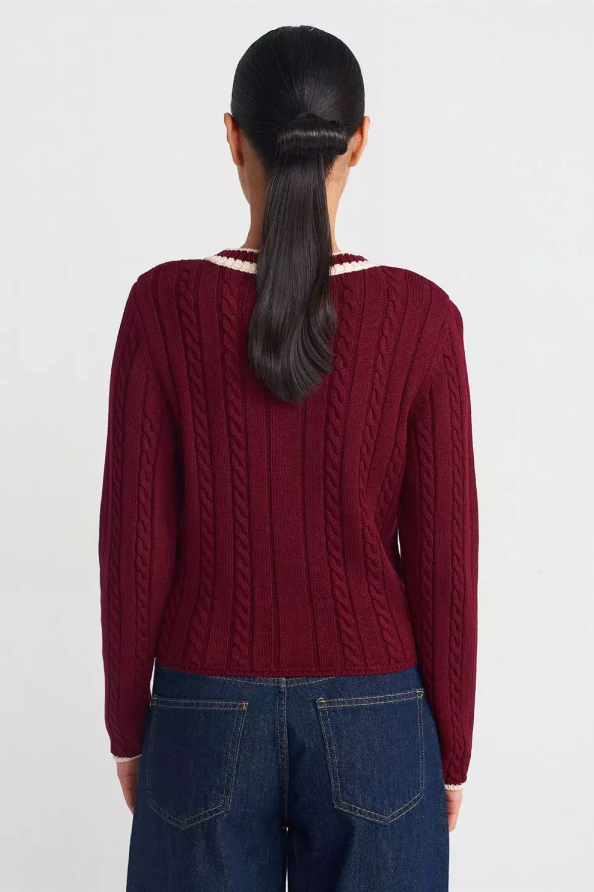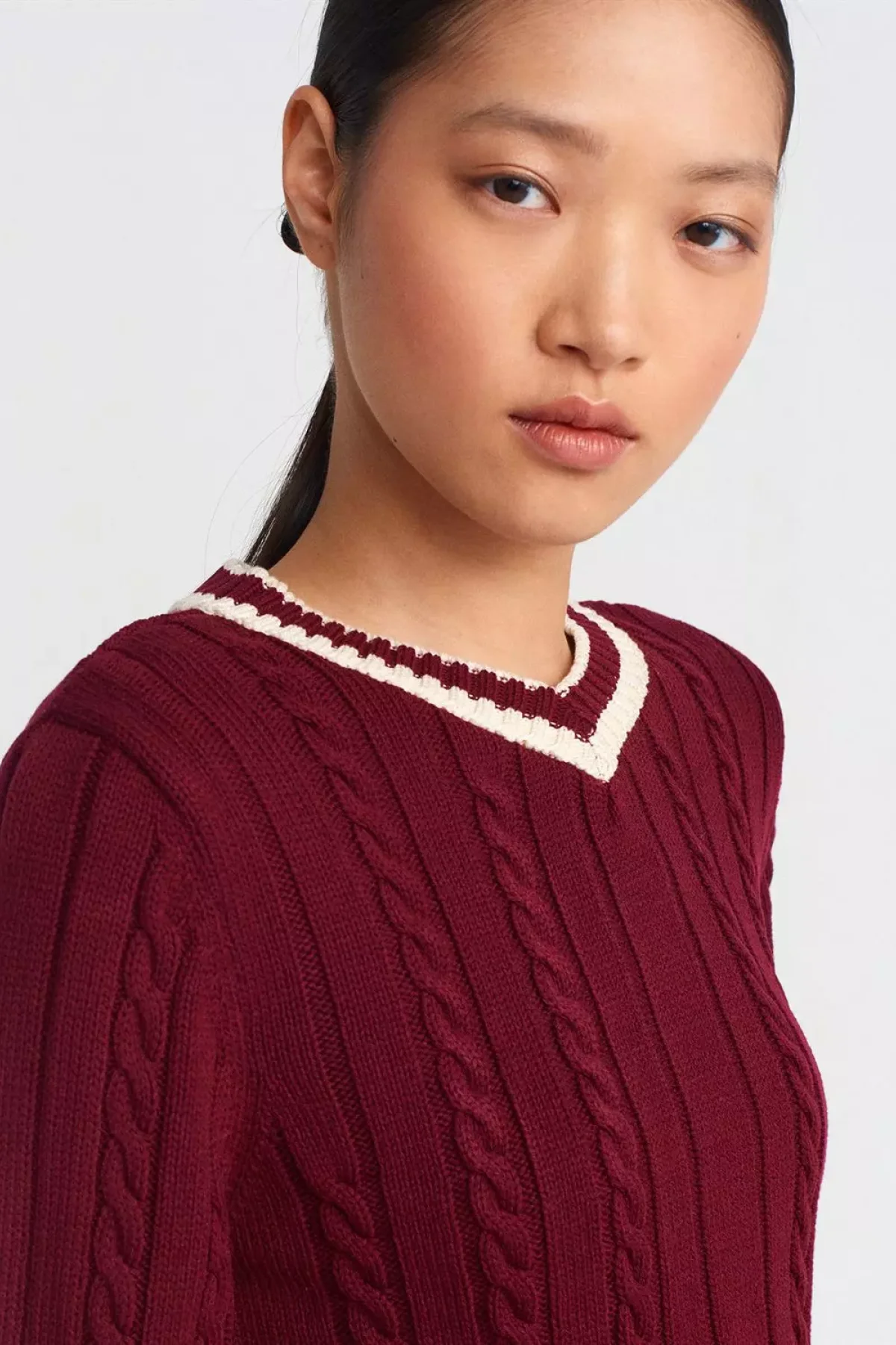 V Yaka Çizgili Saç Örgü Bordo Ekru Kazak