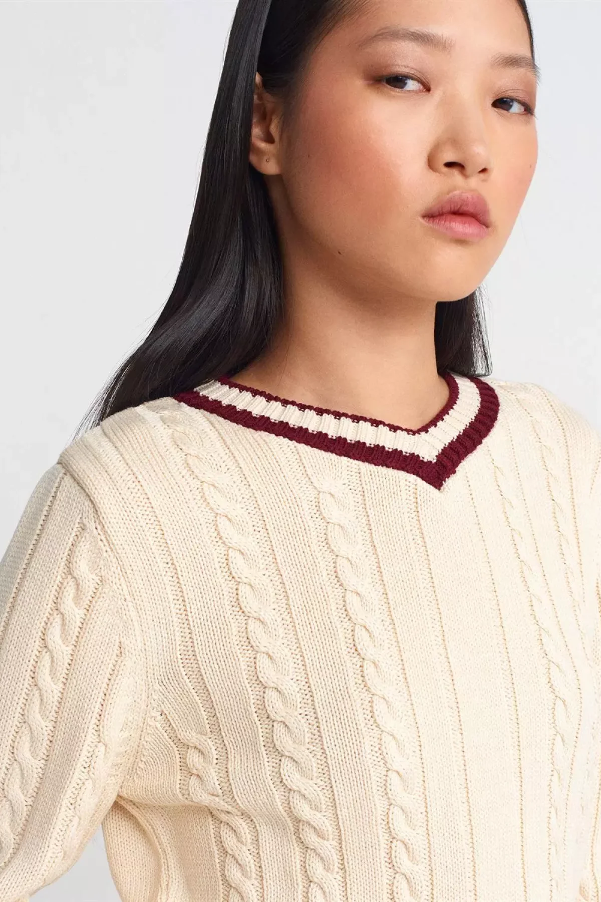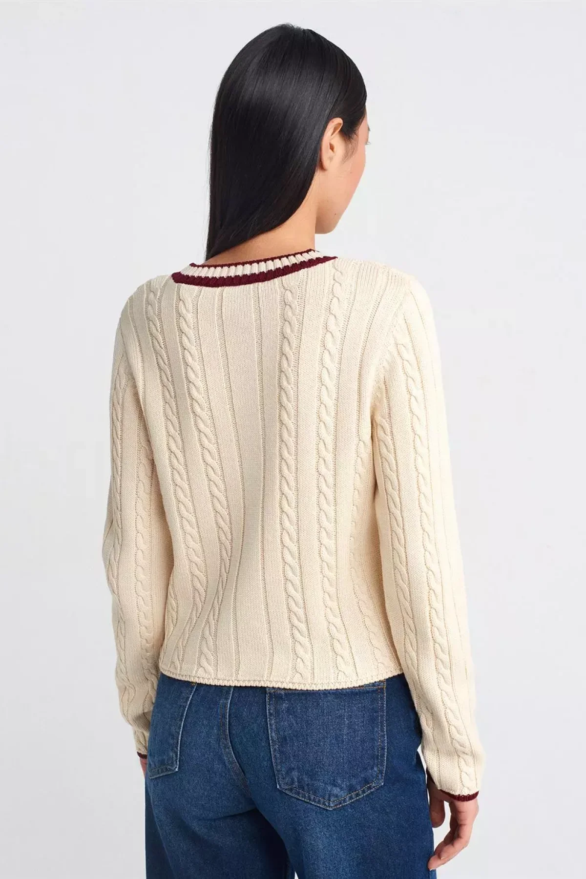 V Yaka Çizgili Saç Örgü Ekru Bordo Kazak