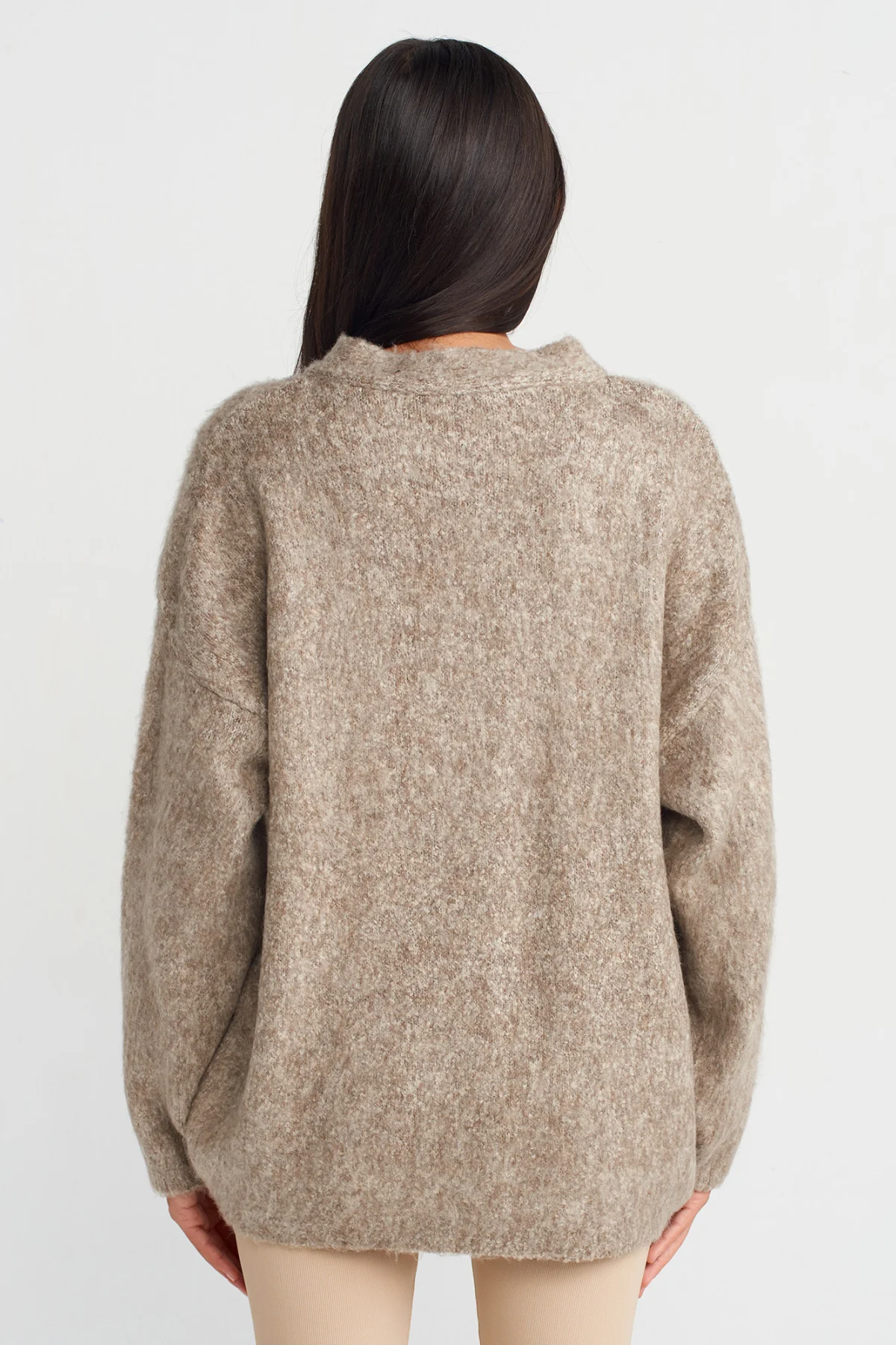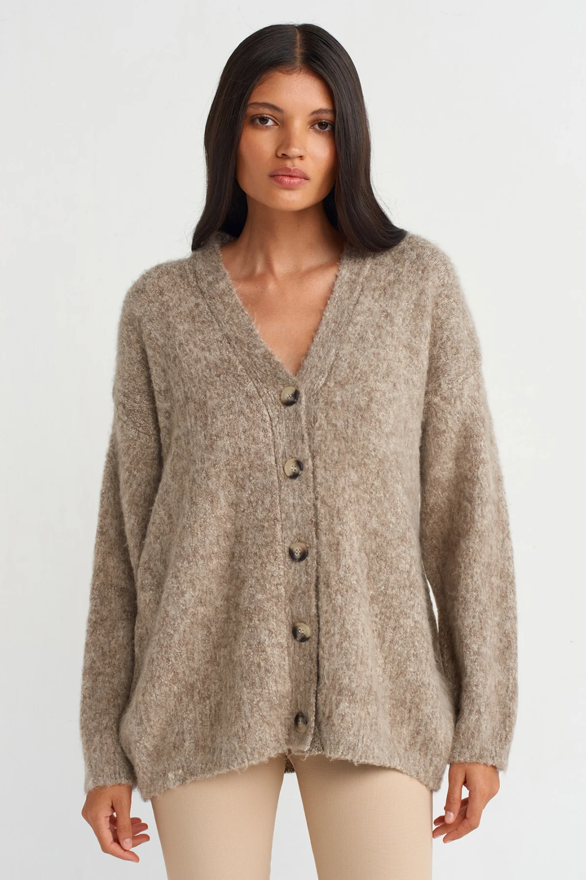 “V Yaka Şardonlu Düğmeli Triko Vizon Hırka” için yorum yapan ilk kişi siz olun
