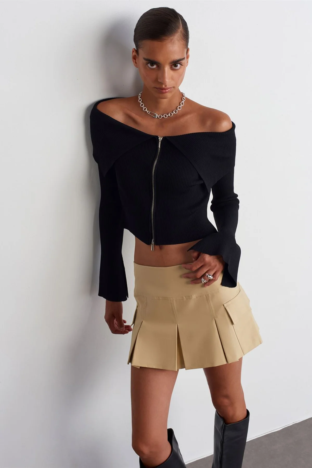Bardot Yaka Fermuarlı Triko Siyah Hırka