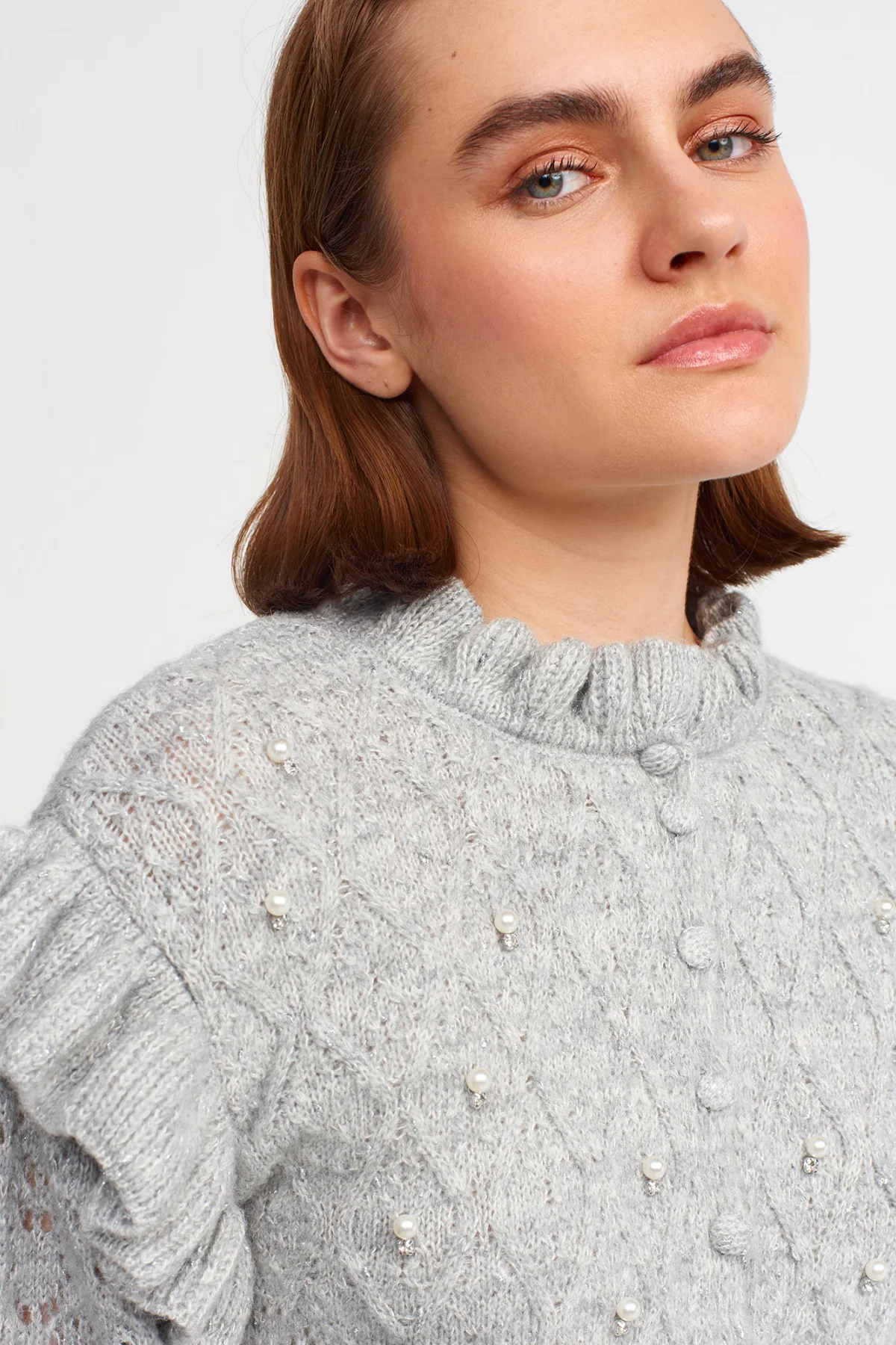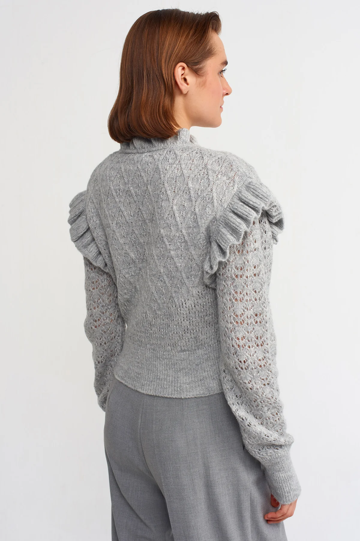 Bisiklet Yaka Fırfırlı Gri Ekru Hırka