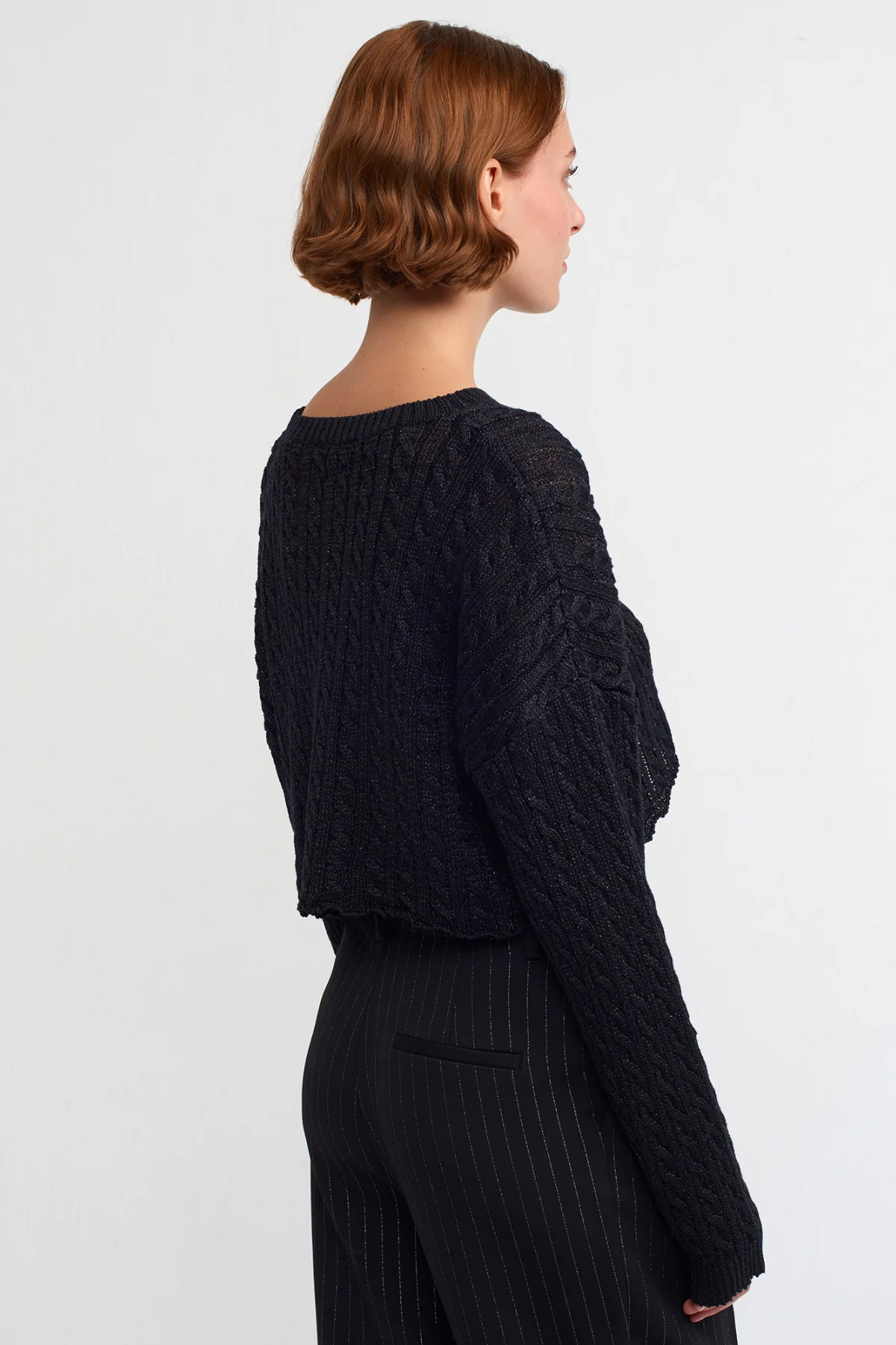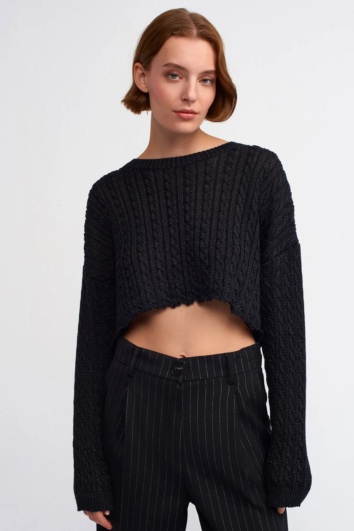 Bisiklet Yaka Saç Örgülü Siyah Crop Kazak
