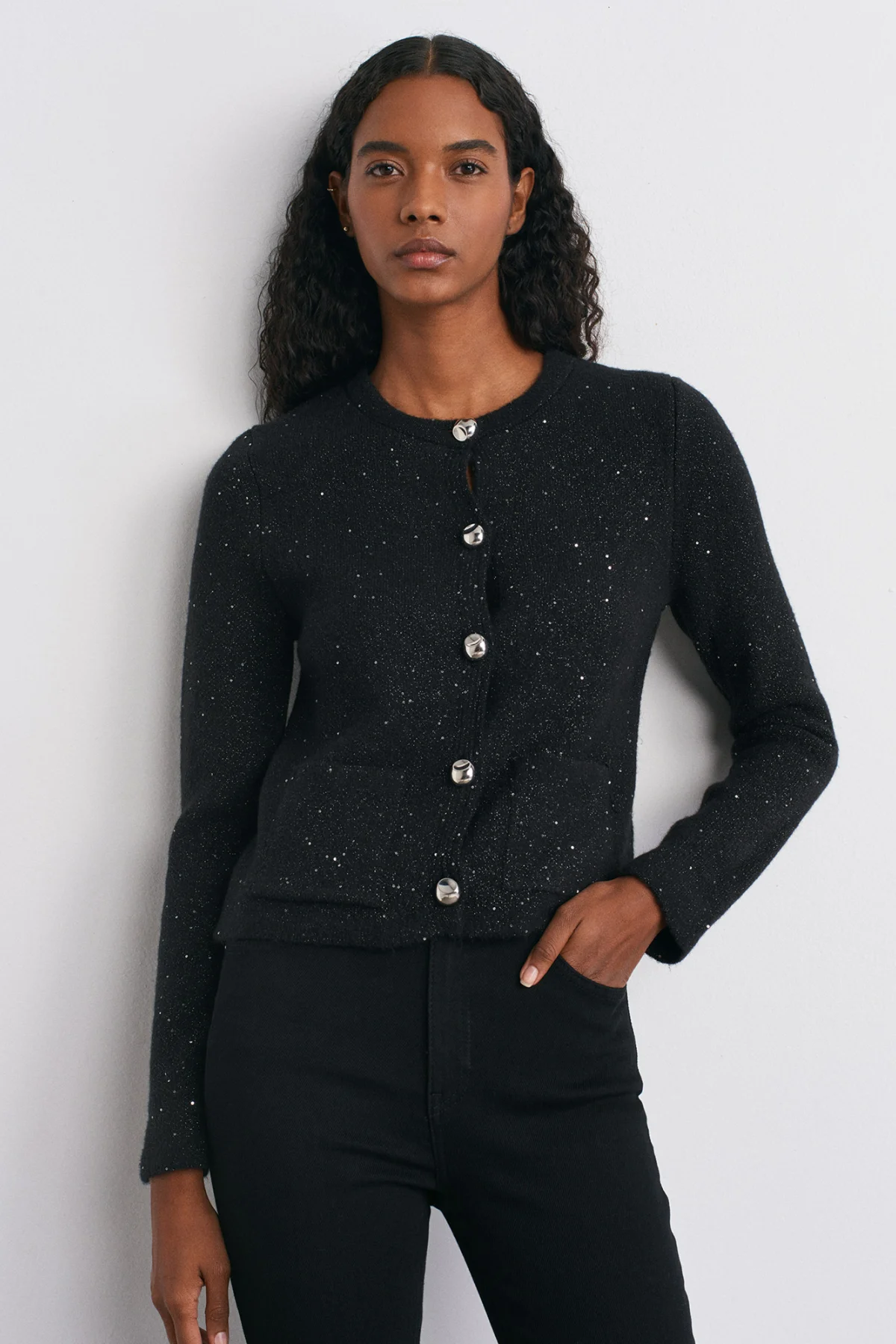 Bisiklet Yaka Pullu Simli Siyah Hırka