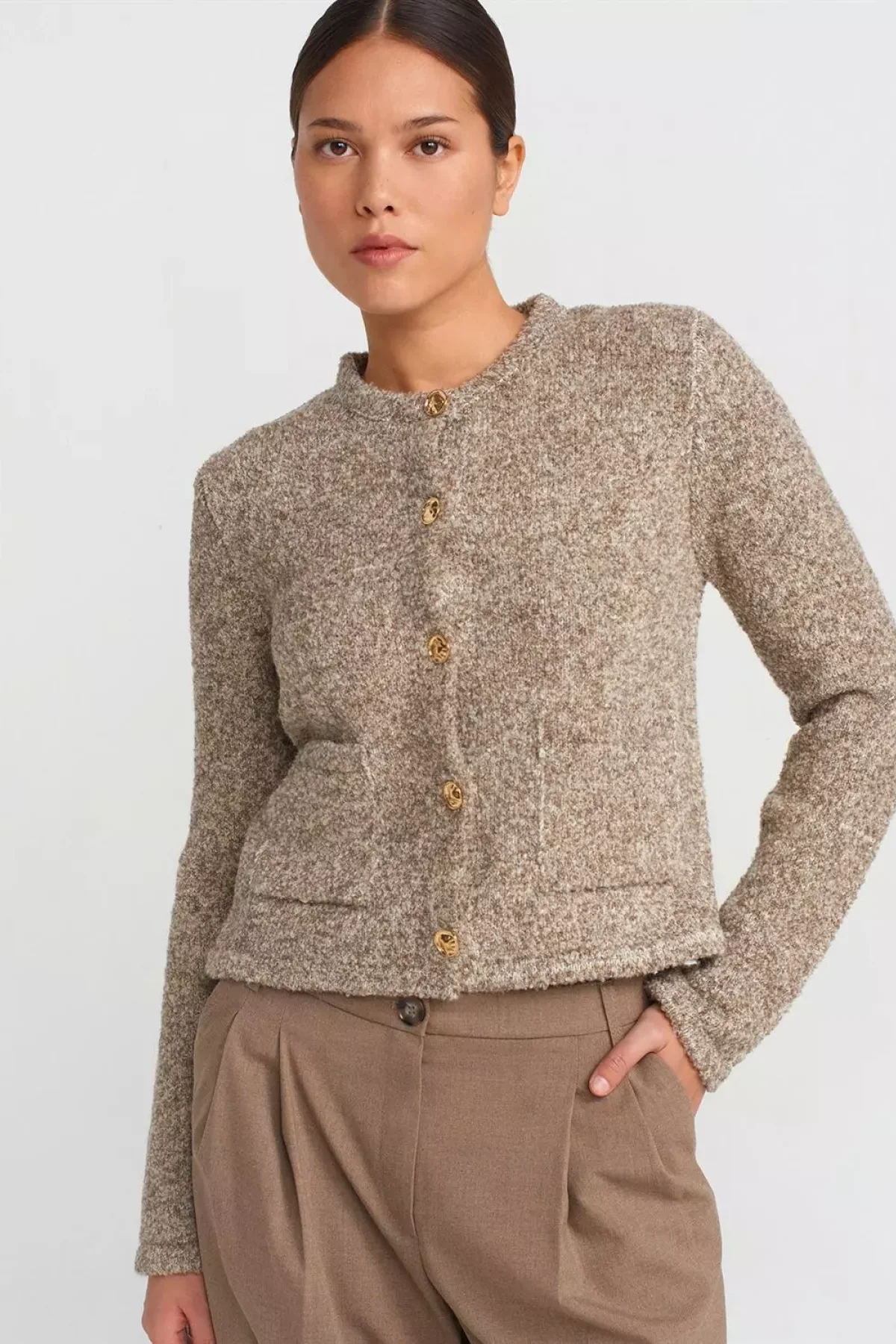 Buklet Cepli Düğmeli Vizon Triko Hırka