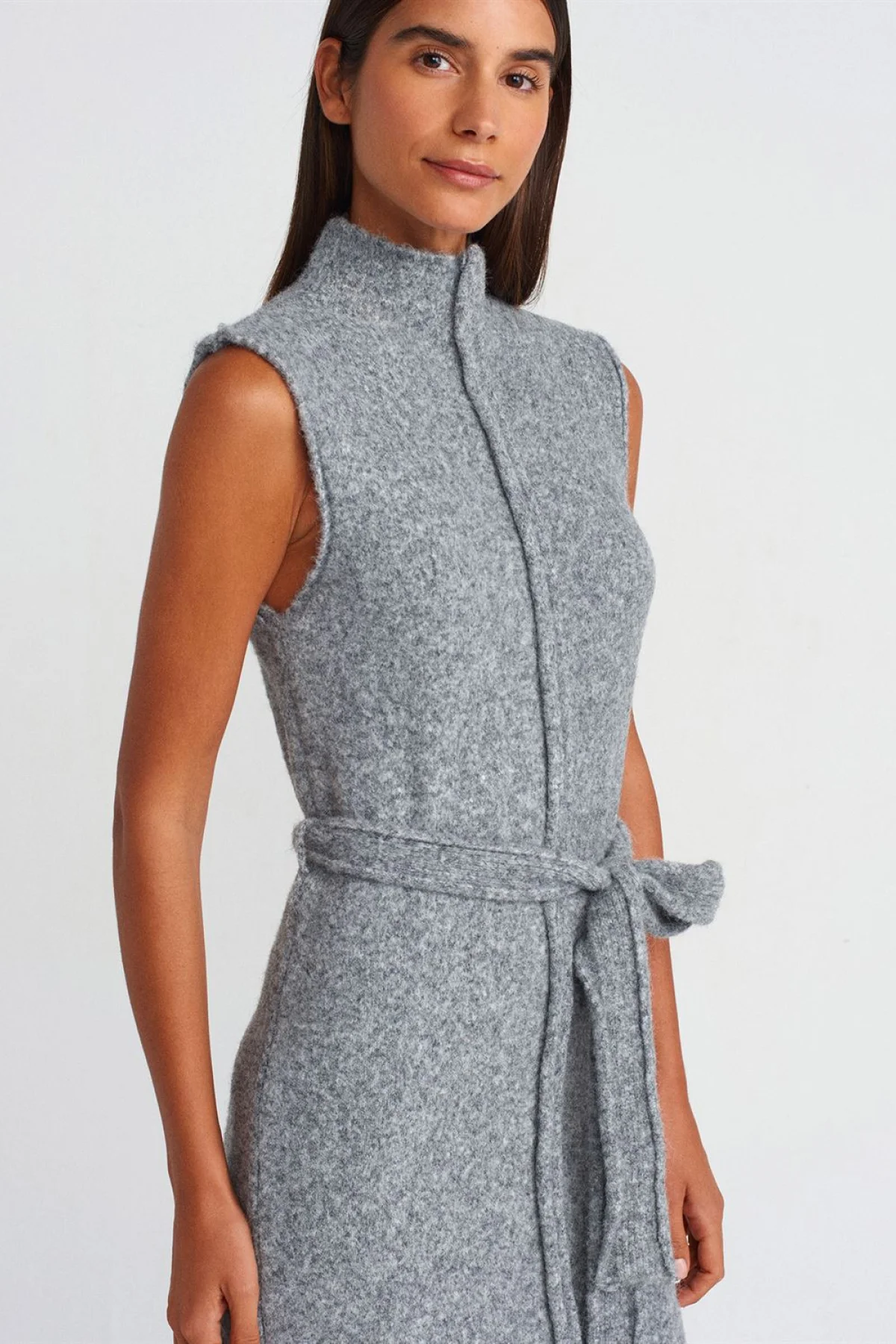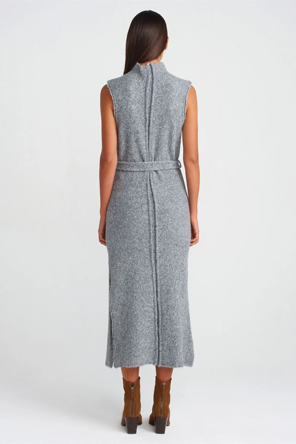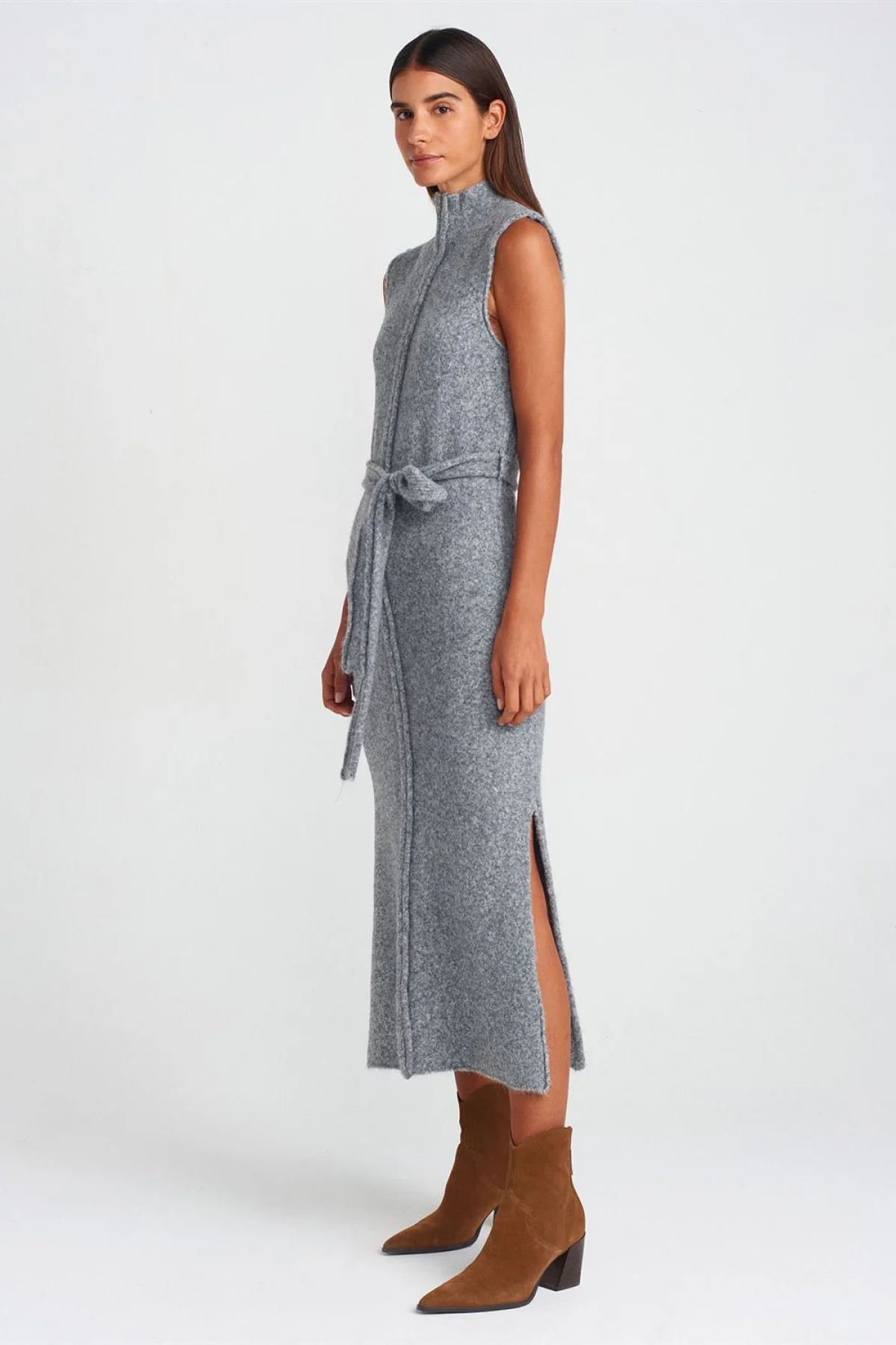 Dik Yaka Yırtmaç Detaylı Füme Elbise