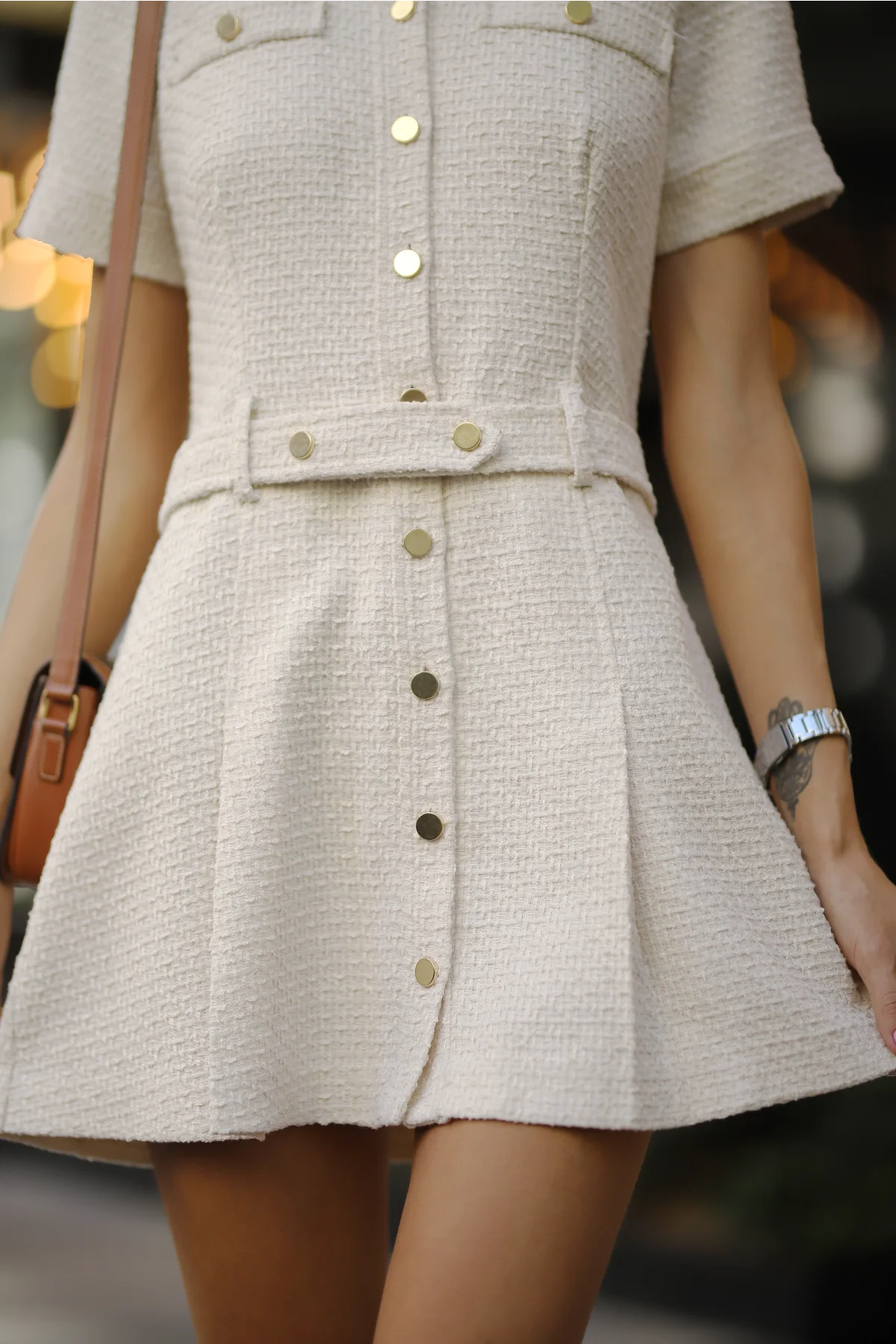 Düğmeli Kısa Krem Tüvit Elbise