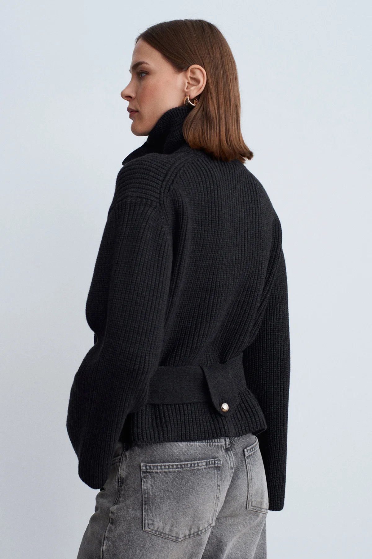 Fermuarlı Kemerli Yünlü Antrasit Hırka