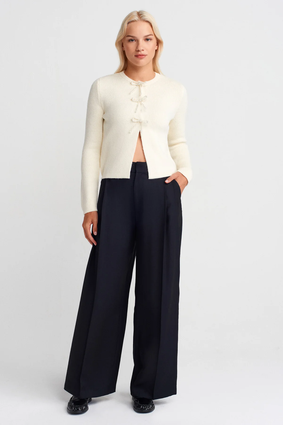 “İncili Fiyonk Aksesuarlı Ekru Hırka” için yorum yapan ilk kişi siz olun