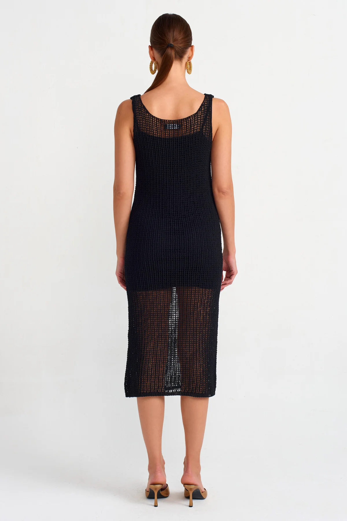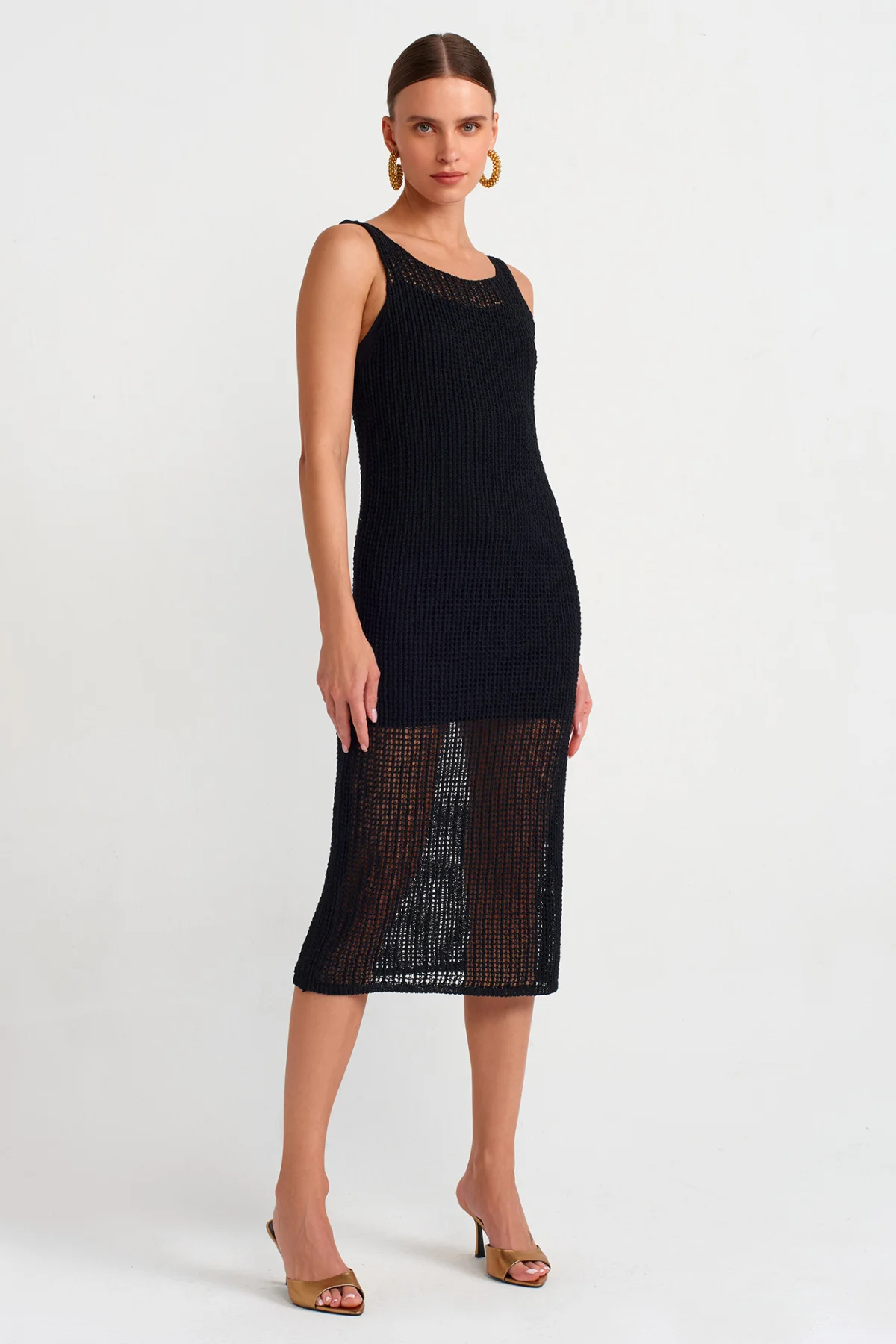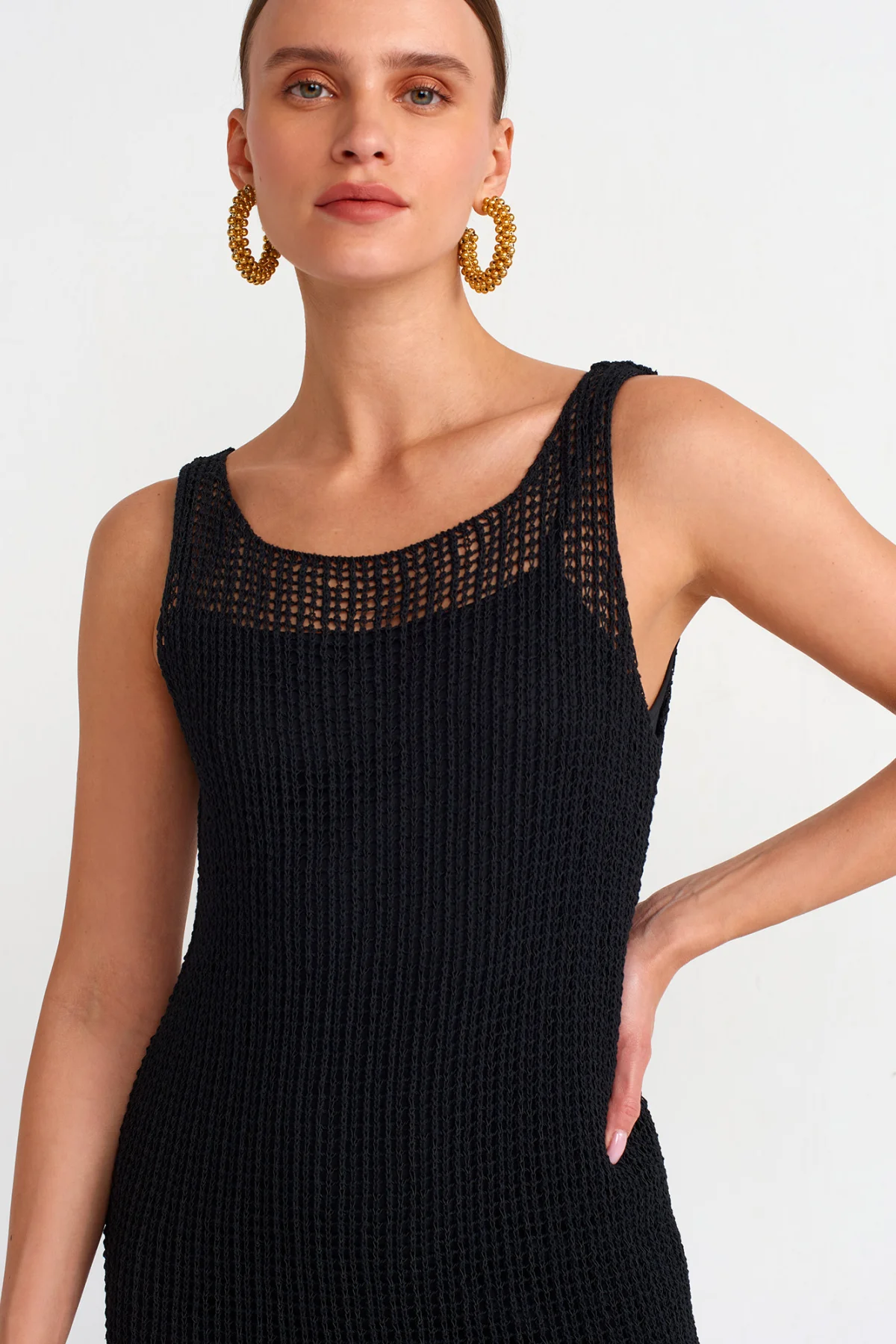 Kalın Askılı Ajurlu Astarlı Triko Siyah Elbise