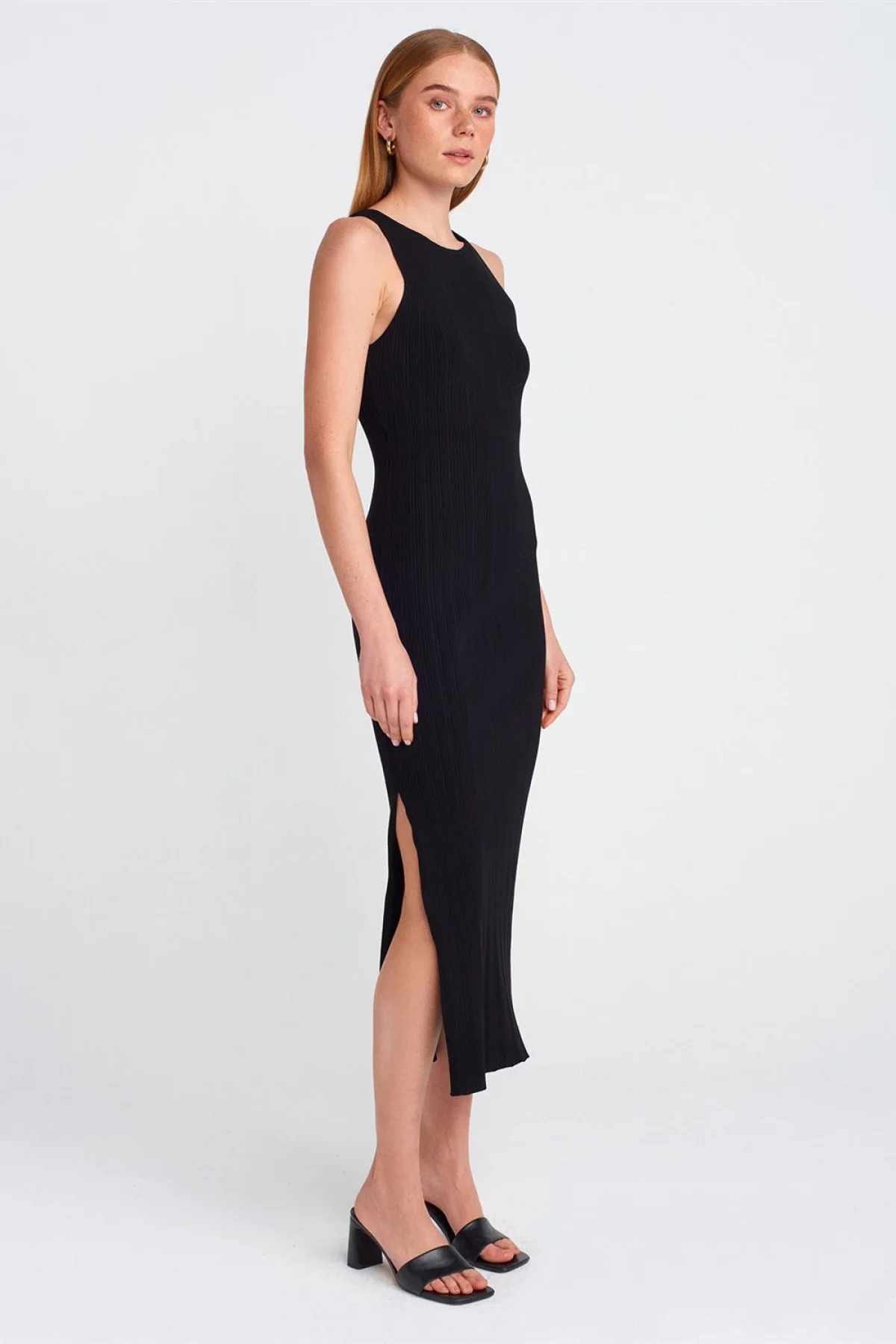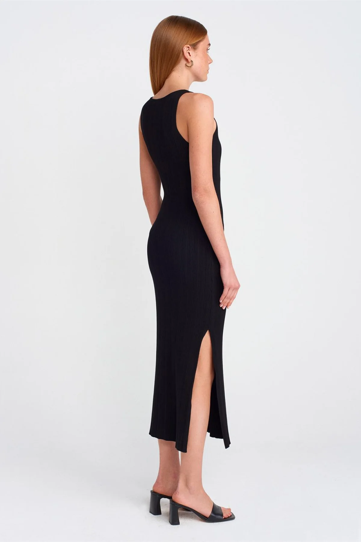 Kayık Yaka Fitilli Yırtmaçlı Siyah Elbise