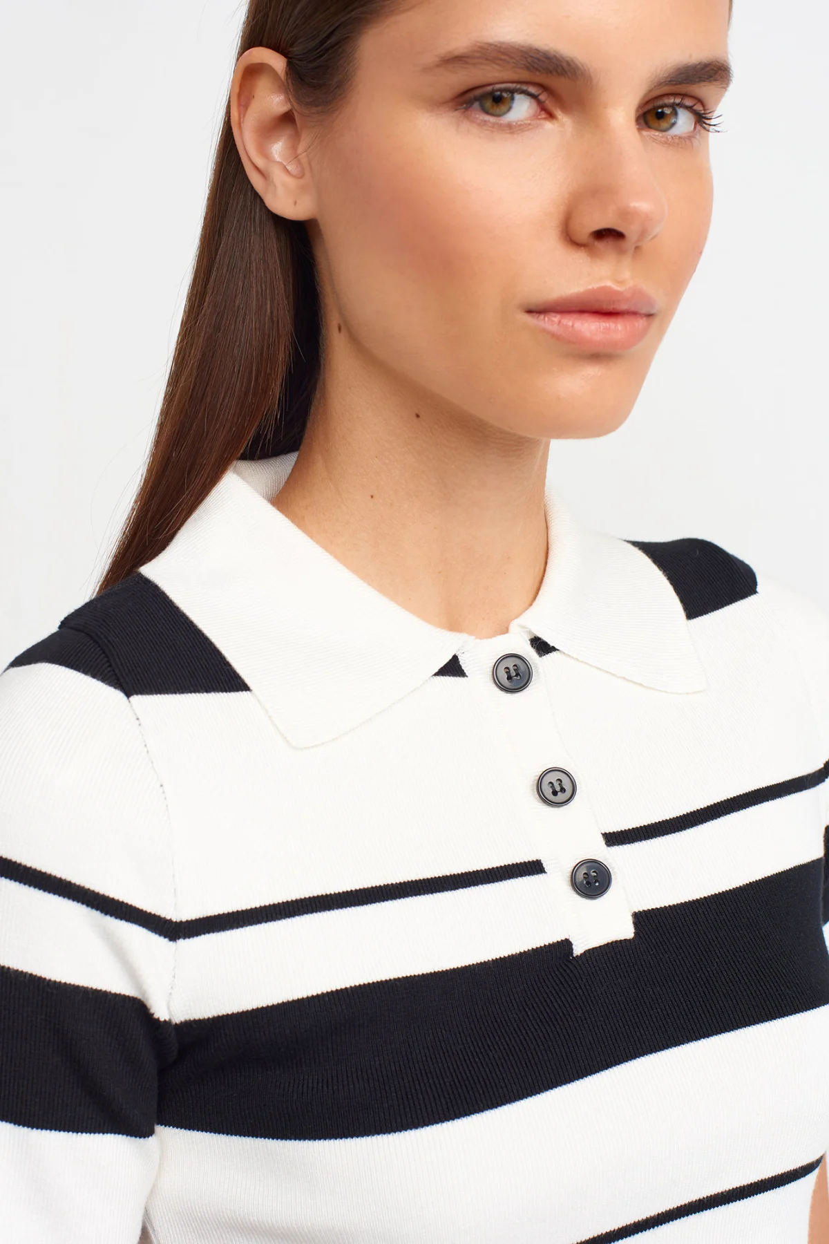 Polo Yaka Çizgili Düğmeli Triko Kazak