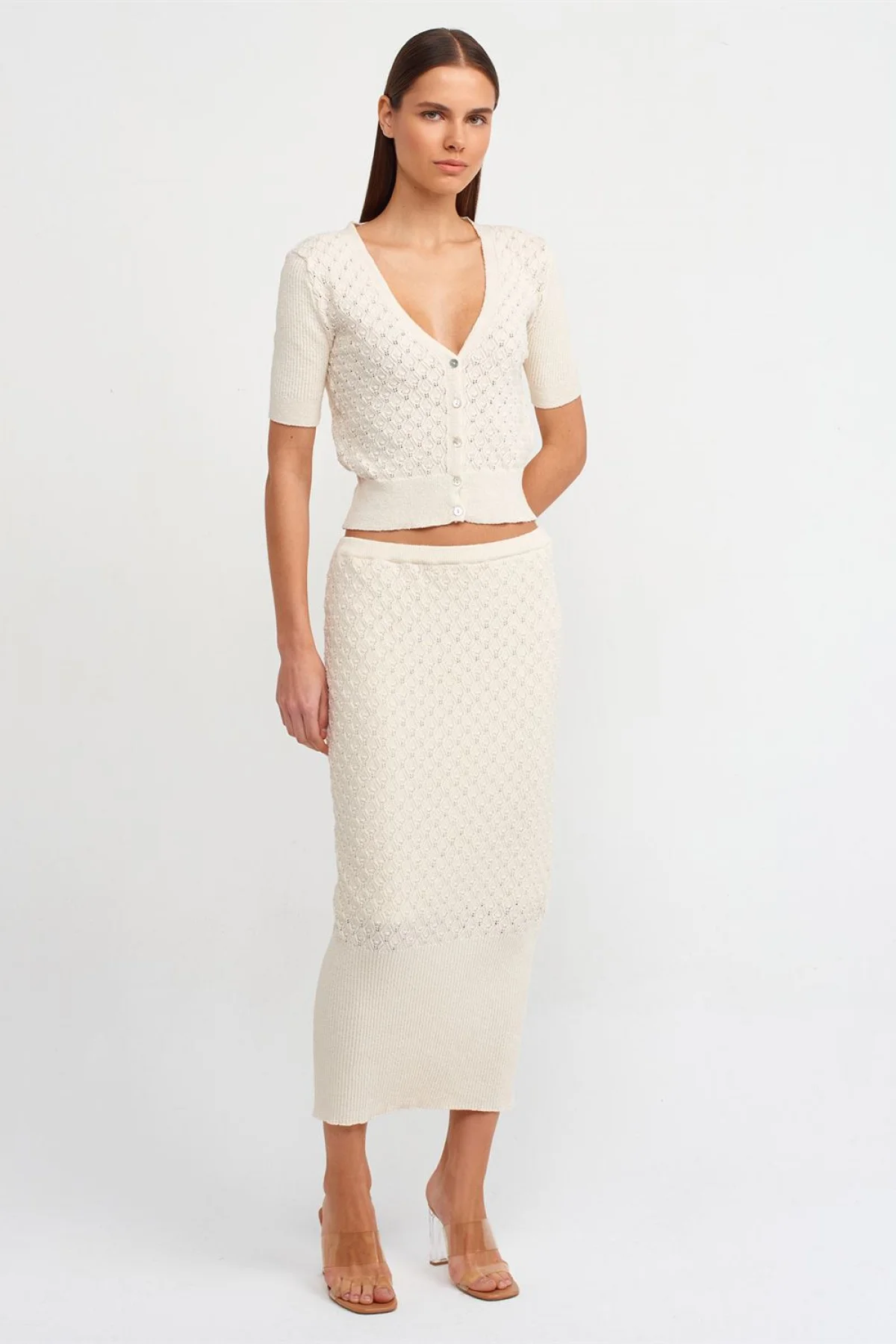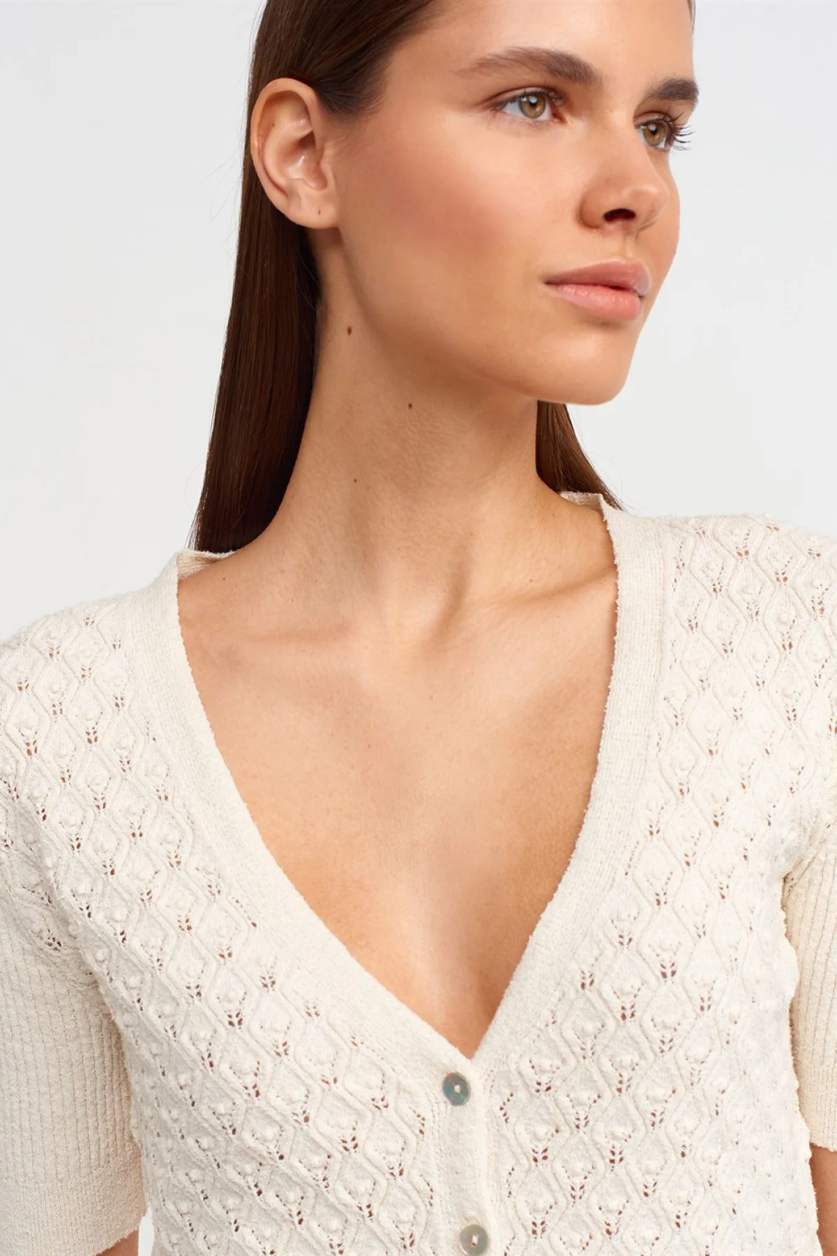 V Yaka Ajurlu Düğmeli Triko Ekru Hırka