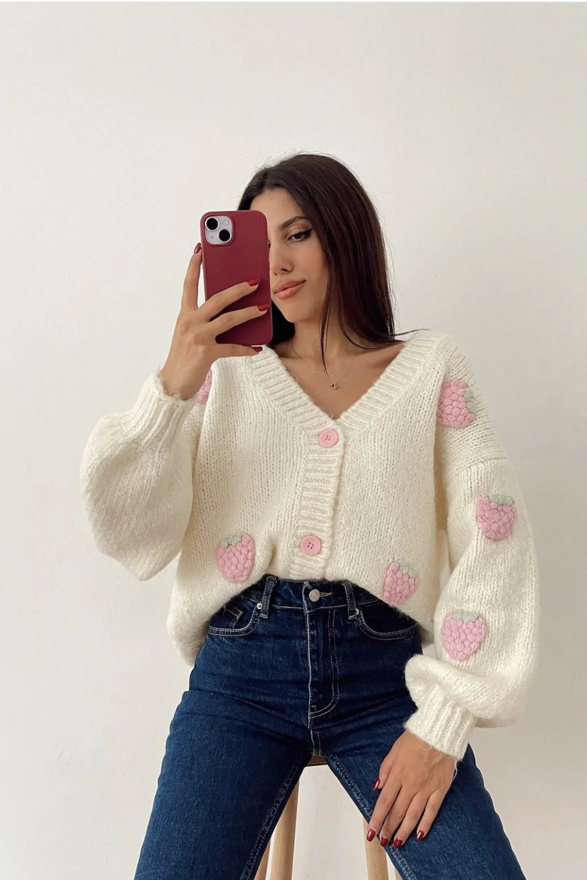 V Yaka Çilek Nakışlı Balon Kol Ekru Hırka