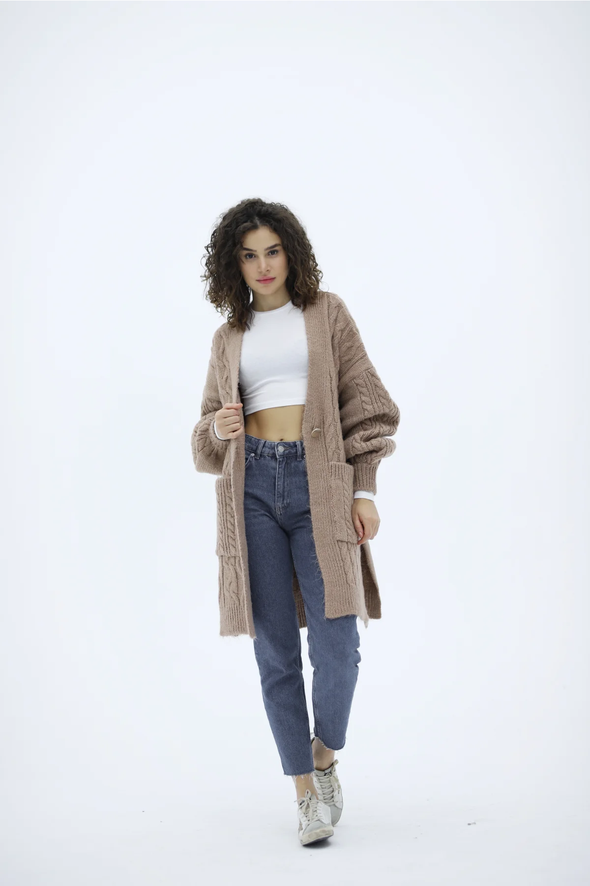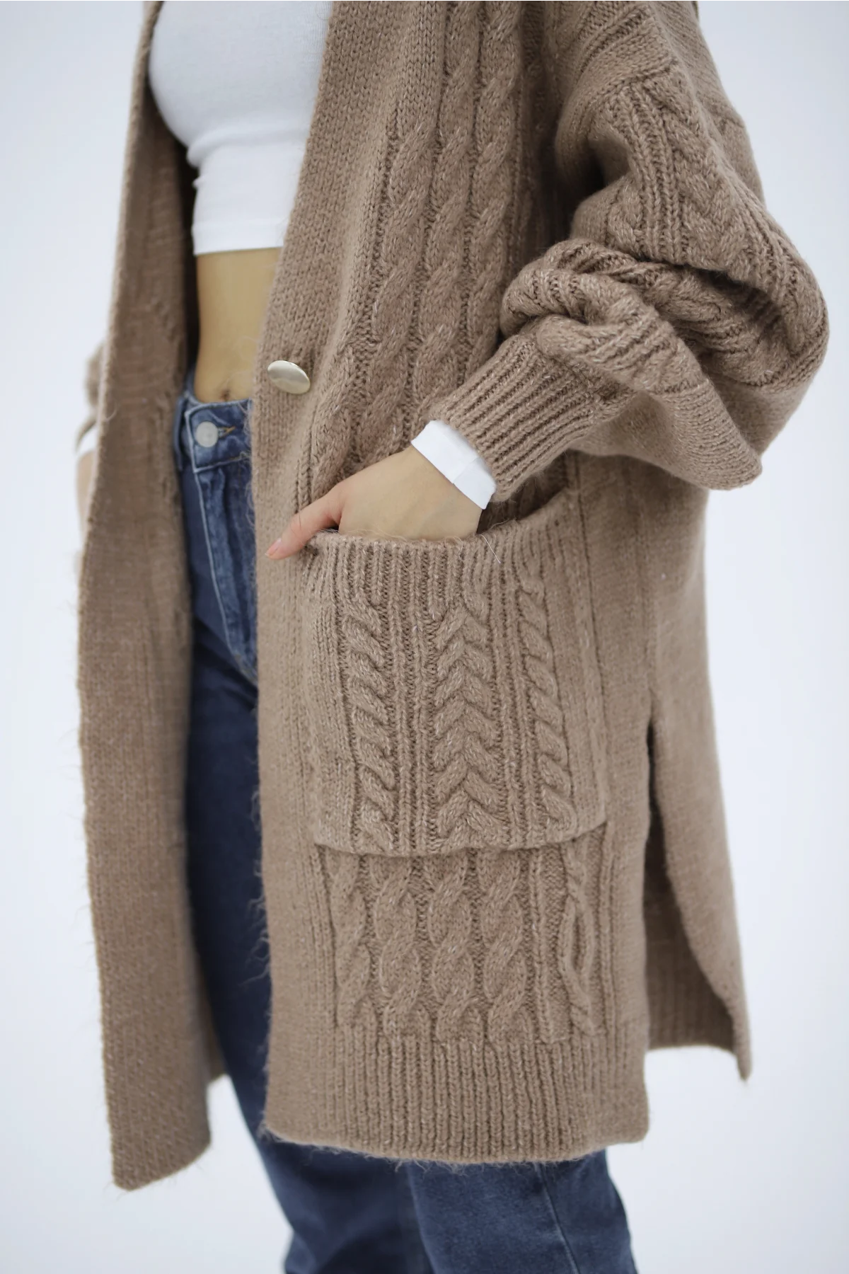 V Yaka Tek Düğmeli Camel Hırka