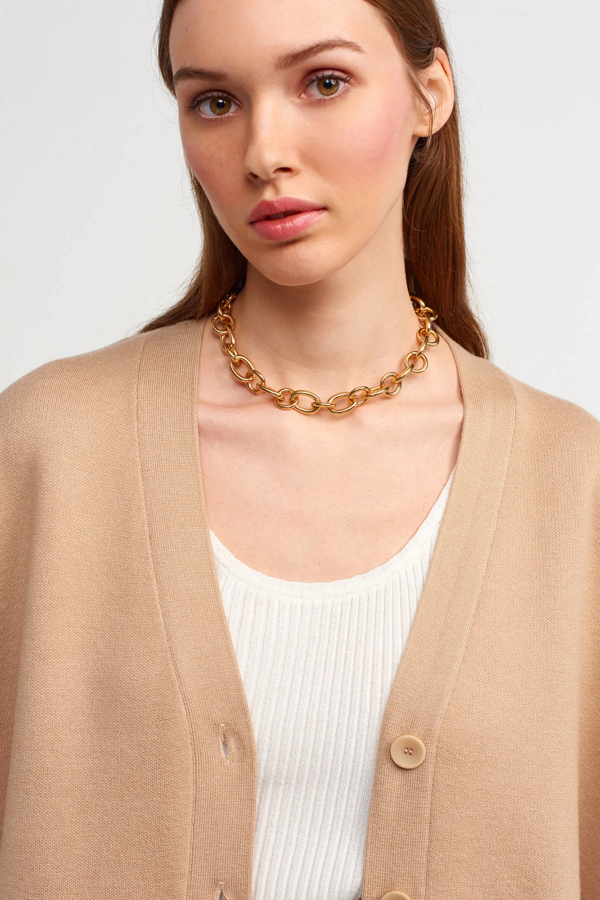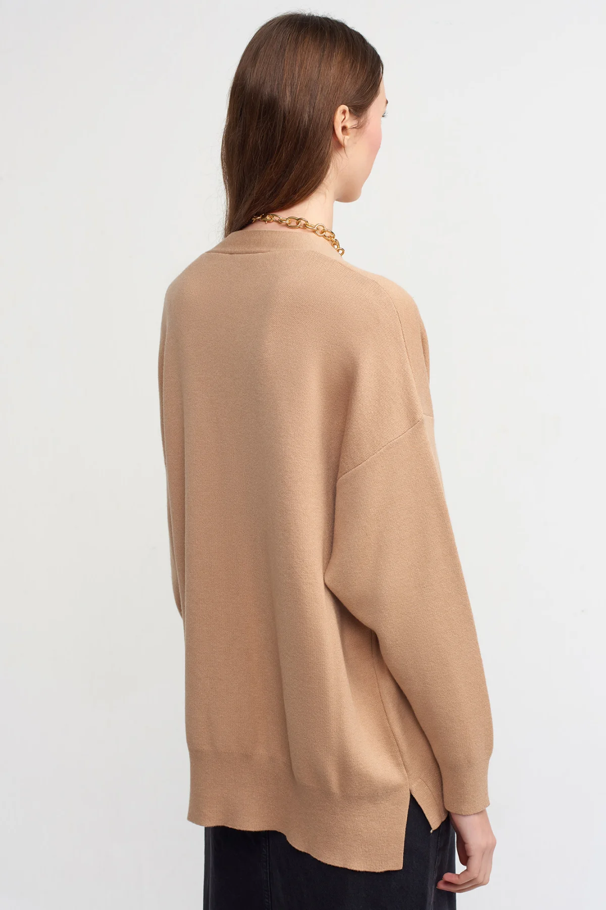 V Yaka Yırtmaçlı Koyu Bej Hırka