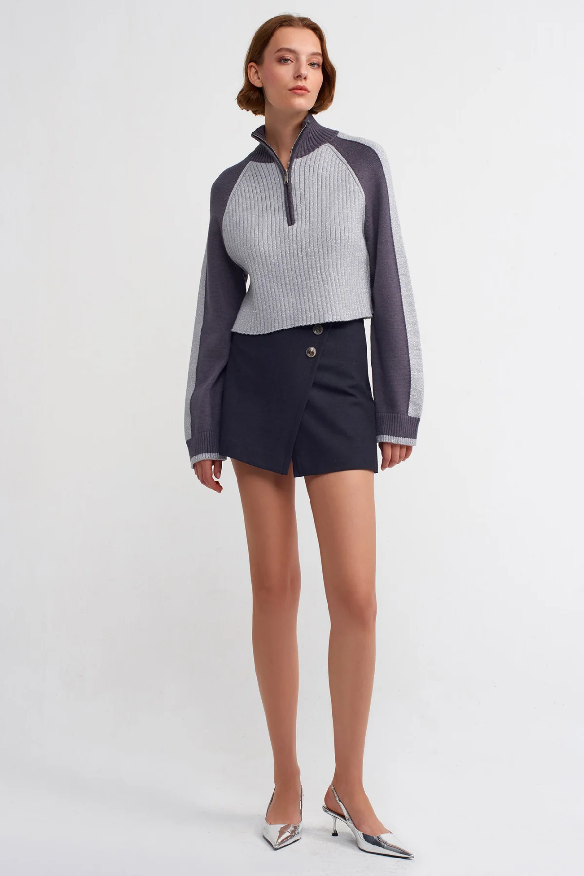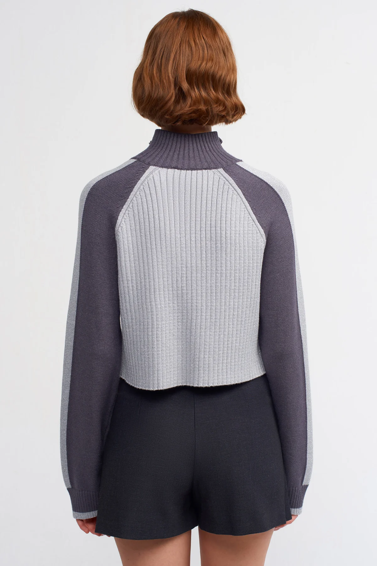 Yarım Balıkçı Fermuarlı Simli Açık Gri Kazak